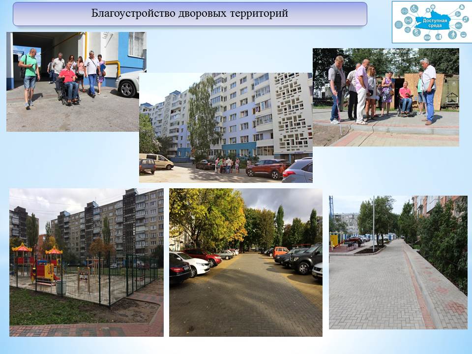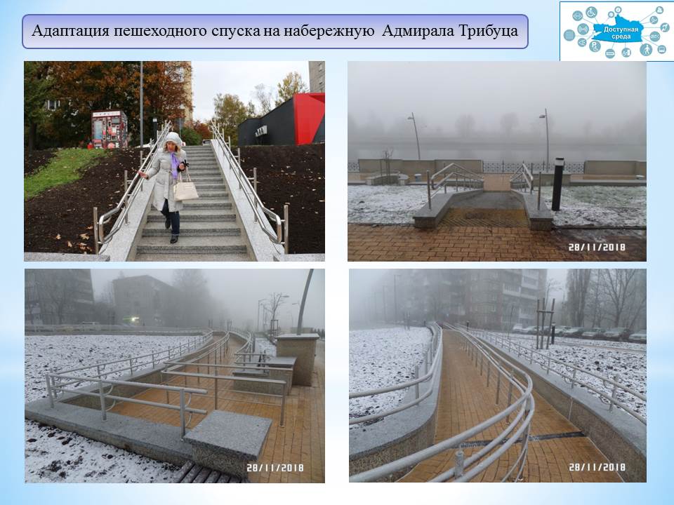 В результате повышена доступность таких объектов, как «Янтарный парус», зоопарк, «Комплексный центр социального обслуживания населения в г. Калининграде», Детский центр отдыха и оздоровления детей и подростков «Бригантина», на набережной Адмирала Трибуца обустроен спуск с лестницей и пандусом. Финансирование данных мероприятий осуществлялось из различных источников, как из средств городского бюджета, так и федерального и регионального, а также внебюджетных средств.