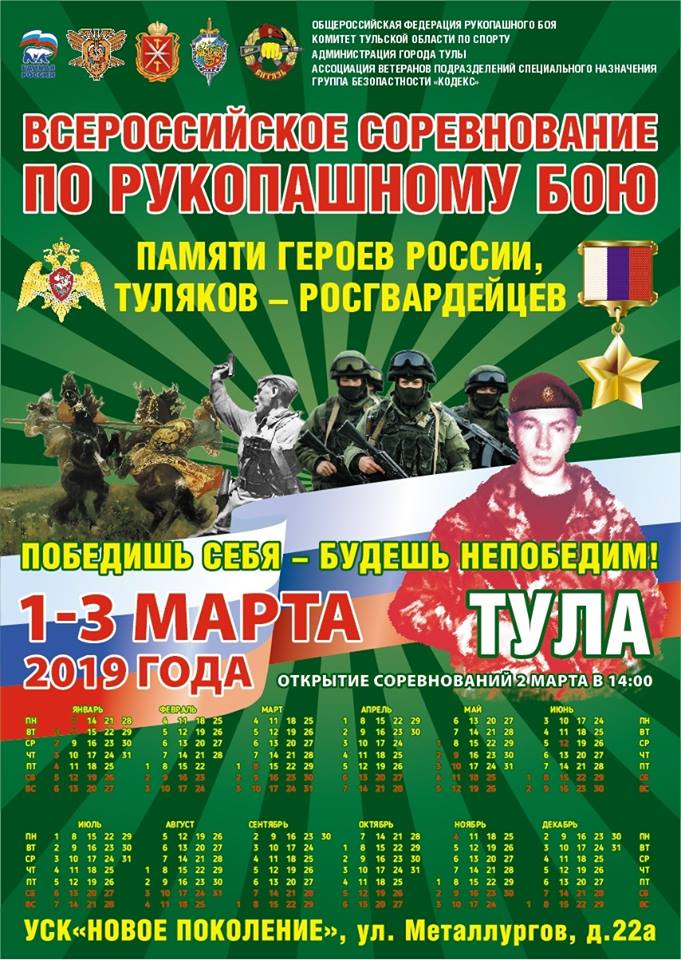 С 1 по 3 марта в Тульской области прошло Всероссийское соревнование по рукопашному бою среди юношей и девушек 12-17 лет, юниоров и юниорок 18-21 лет, посвященное памяти героев России, туляков-росгвардейцев.
