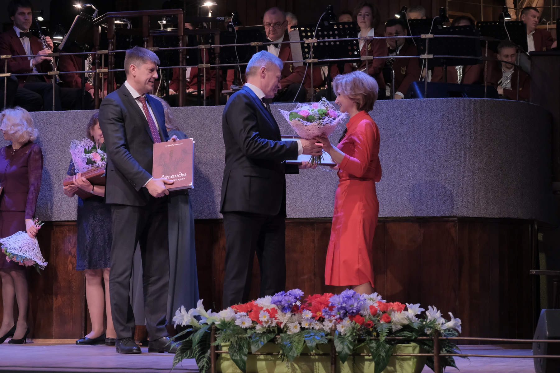 Под аплодисменты зала на сцену поднялась Ирина Тарновская, преподаватель по классу фортепиано МАУ ДО «ДМШ им. Р.М. Глиэра» и её коллеги: преподаватель по классу фортепиано и концертмейстер хорового отделения мальчиков МАУ ДО ДШИ им. П.И. Чайковского Елена Лущенко, преподаватель по классу фортепиано МАУ ДО «ДШИ им. Ф. Шопена» Ирина Куклина, преподаватель по классу фортепианного МАУ ДО ДМШ им. М.И Глинки Ирина Кириллова и преподаватель по классу фортепиано МАУ ДО ДМШ «Лира» Ольга Уланова; преподаватель по классу изобразительного искусства МАУ ДО ДХШ Ирина Амиросланова; педагог-организатор МАУ ДО «ДМШ им. Д.Д. Шостаковича» Лариса Соврикова, преподаватель теоретических дисциплин МАУ ДО «ДШИ «Гармония» Наталья Никифорова, библиотекарь МАУК «Калининградская ЦБС» Наталья Демерлий, руководитель народного вокально-инструментального ансамбля «Вереск», МАУК ДК «Чкаловский» Дмитрий Лебедев, сотрудники ДК «Машиностроитель», Дома искусств, музея «Фридландские ворота» и Калининградского зоопарка.