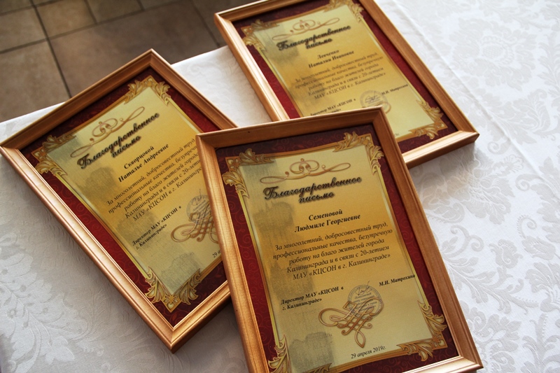 К этим наградам вчера добавились благодарности администрации Калининграда, которыми удостоены сам Центр, его директор Марина Митрохина и социальный работник Людмила Караулова, а также благодарственные письма городского Совета депутатов, Калининградской областной Думы, почётная грамота Министерства социальной политики Калининградской области, благодарственные письма комитета по социальной политике.