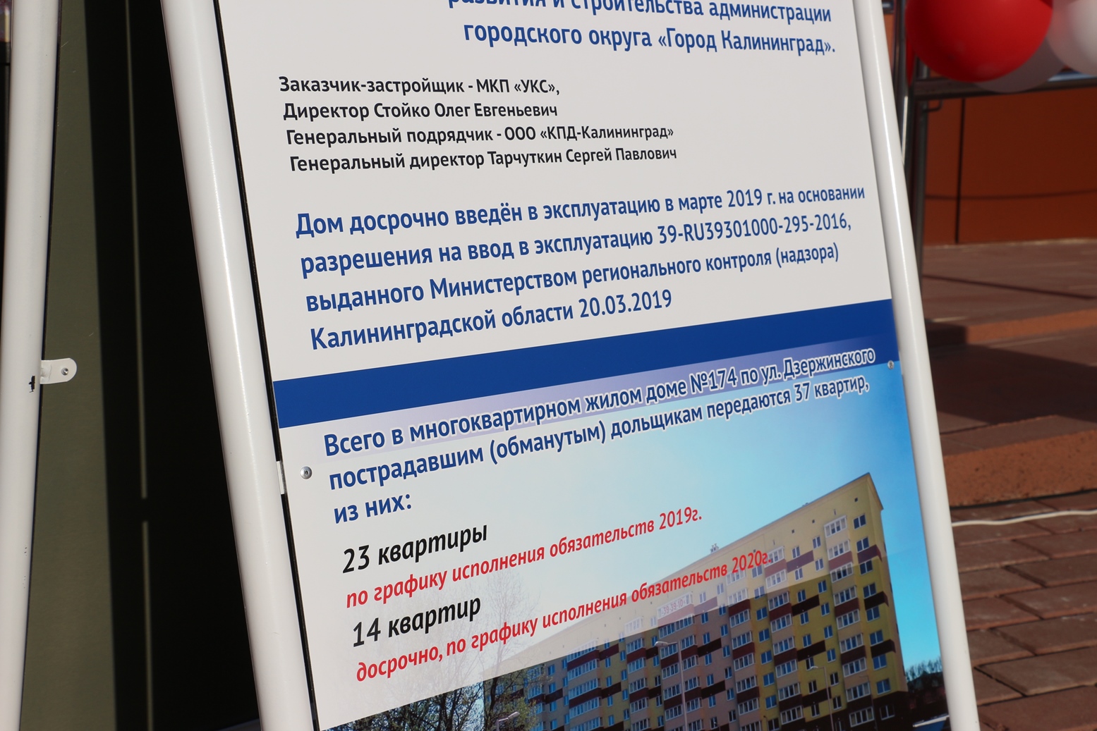 Обязательства по обеспечению квартирами оставшихся 103 дольщиков лежат на МКП «УКС». Предприятие уже выделило часть квартир, в том числе в новом доме на ул. Дзержинского «Мельничный двор», или, например, домах построенных на этой улице компанией «КПД-Калининград».