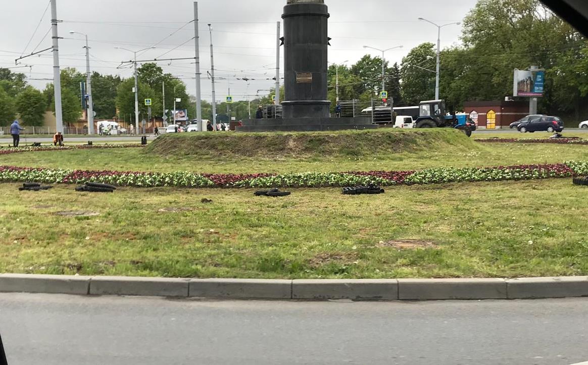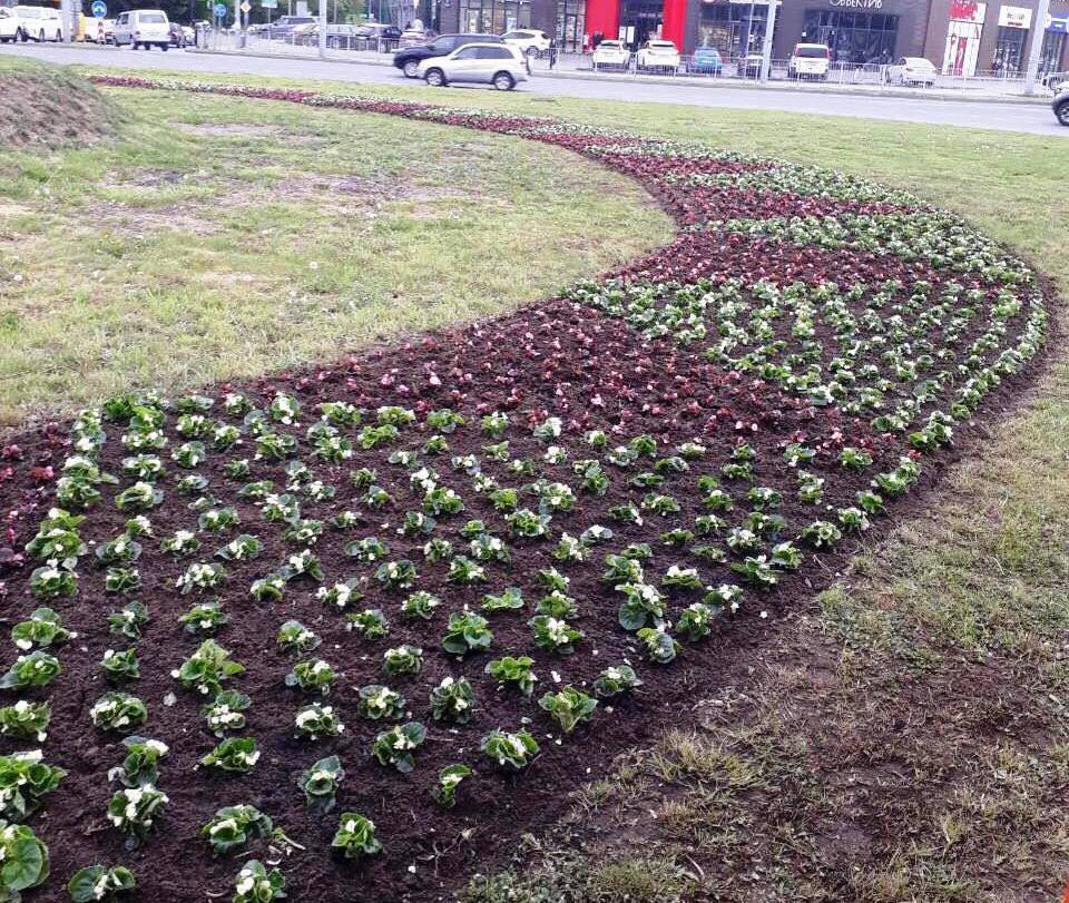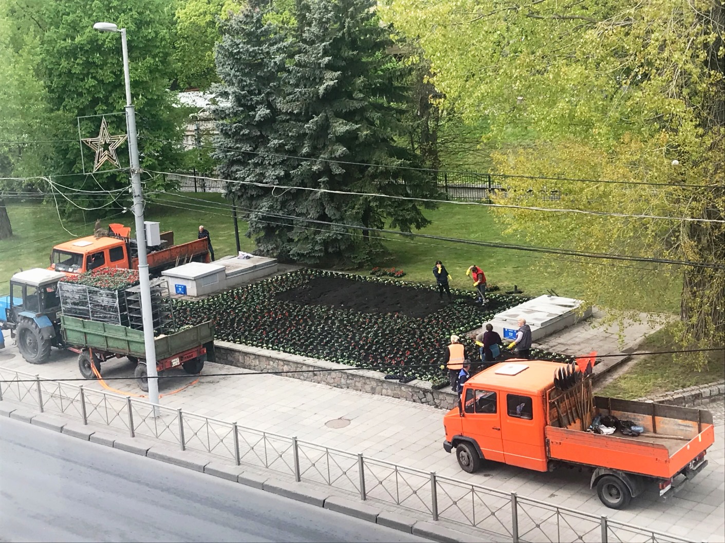 Накануне Дня Победы летнюю цветочную рассаду высадили в цветниках на Гвардейском проспекте. Сегодня летники высаживали в зеленой зоне на круговой развязке в районе площади Василевского.