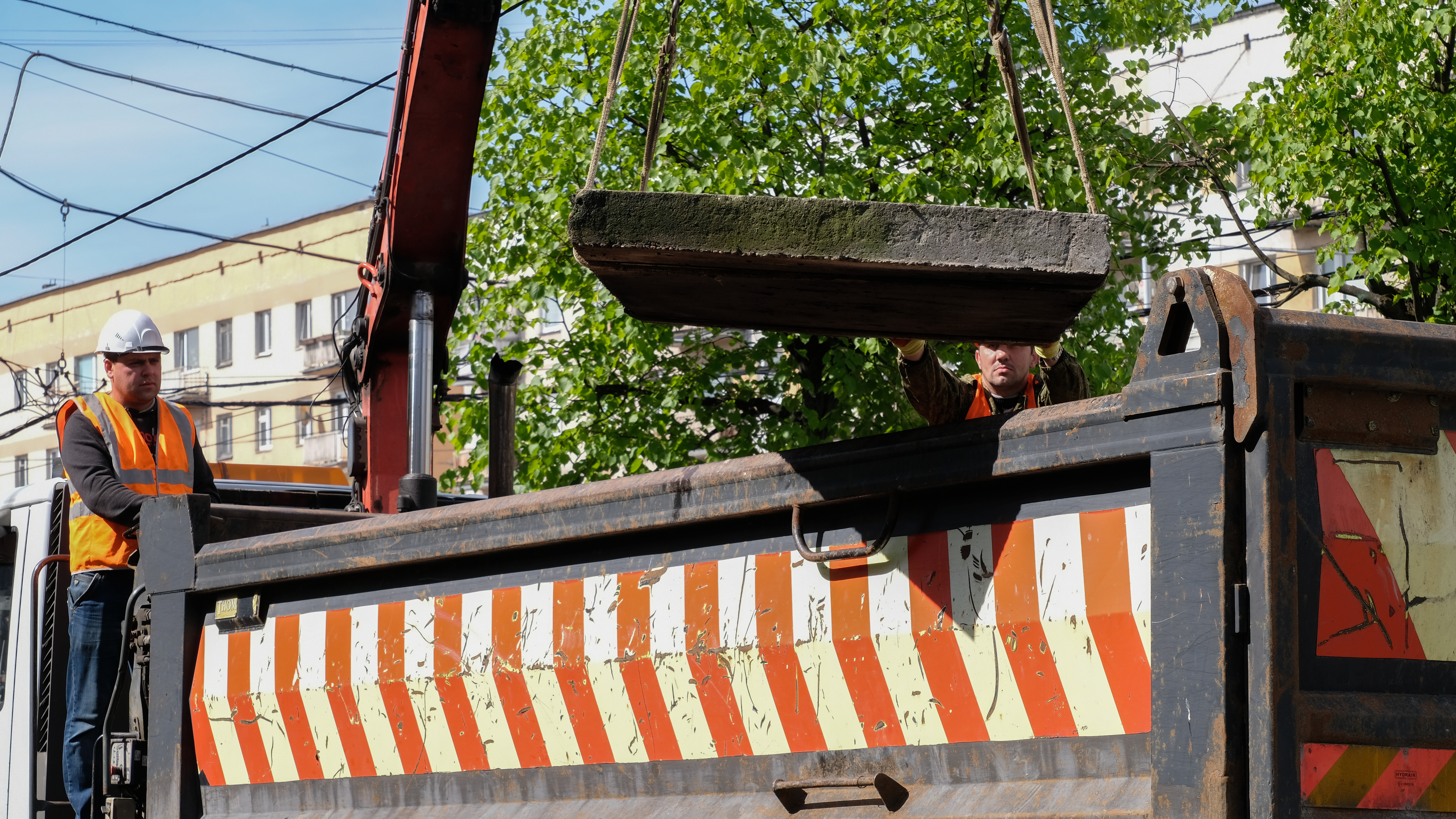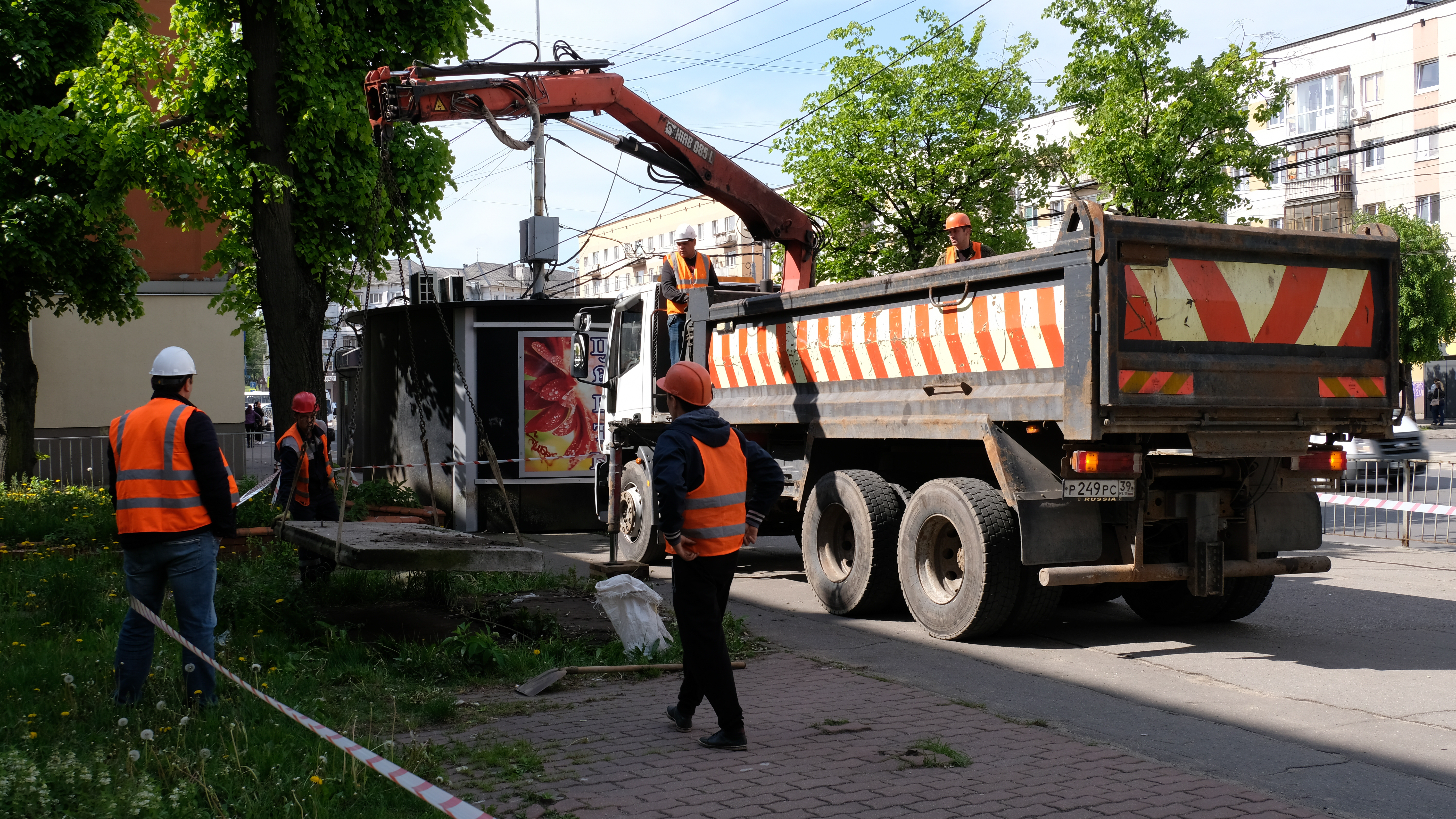 Сегодня на Ленинском проспекте в районе домов № 123-129 демонтированы бетонные плиты, оставшиеся от нестационарного торгового павильона, чей собственник не установлен.