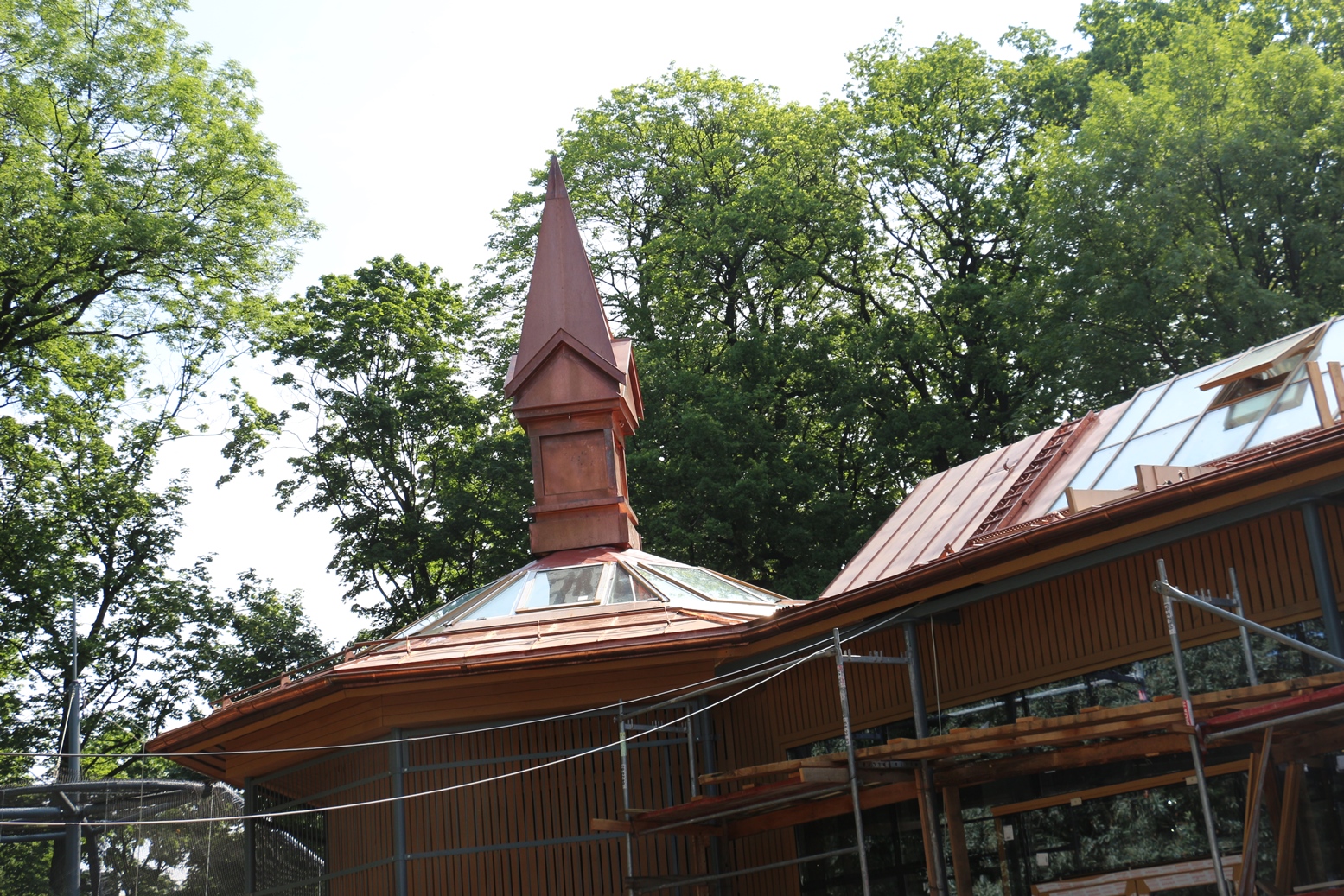 Птицам в новом жилище будет комфортно, поскольку отлично продуманы все системы его жизнеобеспечения. Наружные вольеры в нем предусмотрены с крышей башенками, с глухими стенами и с сохранением решеток ограждения. Бытовая пристройка – с кирпичными утепленными стенами и эксплуатируемой кровлей с зелеными насаждениями с поверхностной корневой системой. Кровля – с покрытием из шестимиллиметрового медного листа – утеплена минераловатными плитами. Наружные стены здания выстроены из керамического кирпича с утеплением и с последующей обшивкой доской. Цокольная часть стен облицована плиткой из натурального камня.