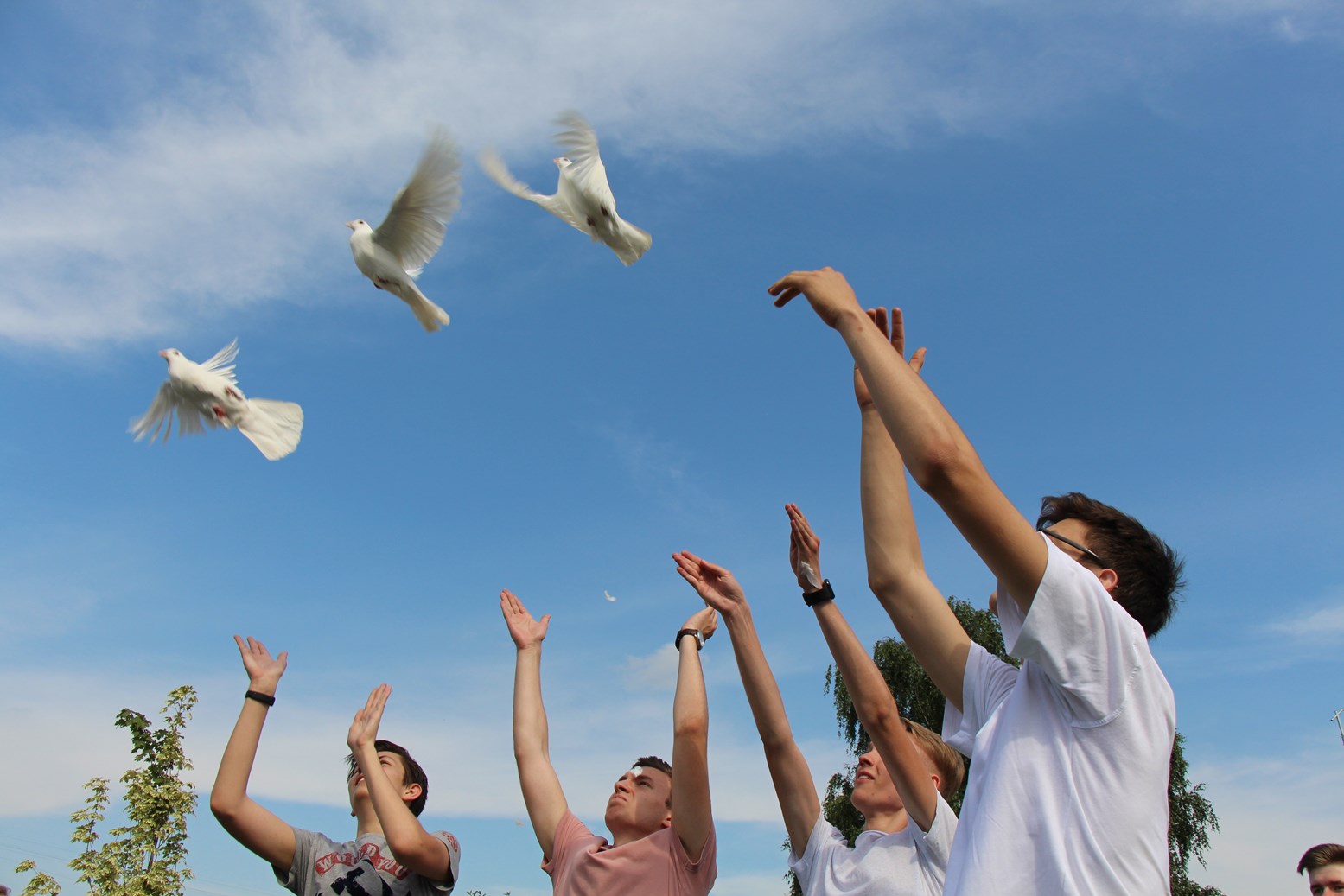 В завершение церемонии выпускники выпустили в небо белых голубей – с верой в мирное и счастливое будущее, и многократно сфотографировались на память – друг с другом, с саженцами, с родителями, учителями и директорами, а также с руководителями города.