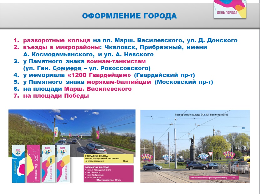 Баннеры, панно, флагштоки украсят центр Калининграда. Особое внимание уделено разработке нового брэндирования и логотипа Дня города. Планируется преобразить не только основную площадку, но и отдаленные уголки Калининграда.