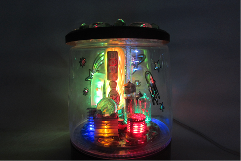 «Так я вижу идеальный микрорайон в моем городе. Он должен состоять из современных футуристических зданий, расцвеченных разноцветными и переливающимися огнями. Внутри моего светильника находятся необычные детали и предметы. Например, у задней стенки – флакон от духов, рядом – лампа от кинопроектора, к корпусу приклеены наклейки. На переднем плане я разместила корпус от микрофона. Маленькие домики – это радиаторы от транзисторов, в которых я сделала отверстия и вставила туда светодиоды. Для схожести с городом у меня стоит машинка. А роль звездного неба выполняют стеклянные шарики», – поясняет свою задумку Полина.