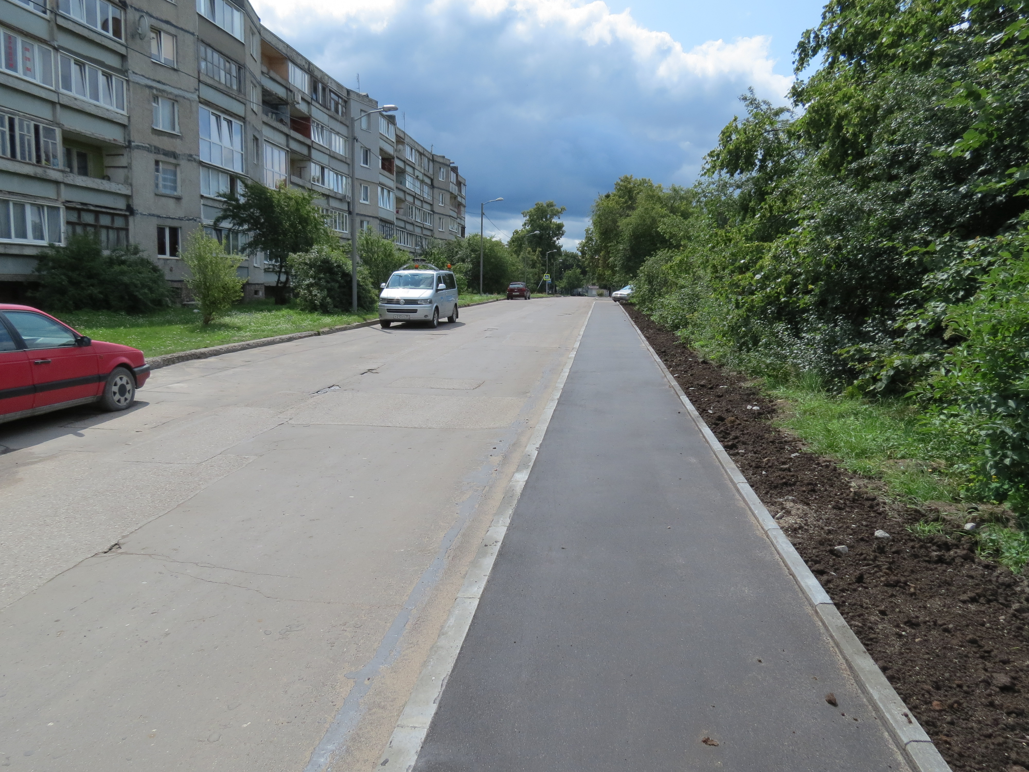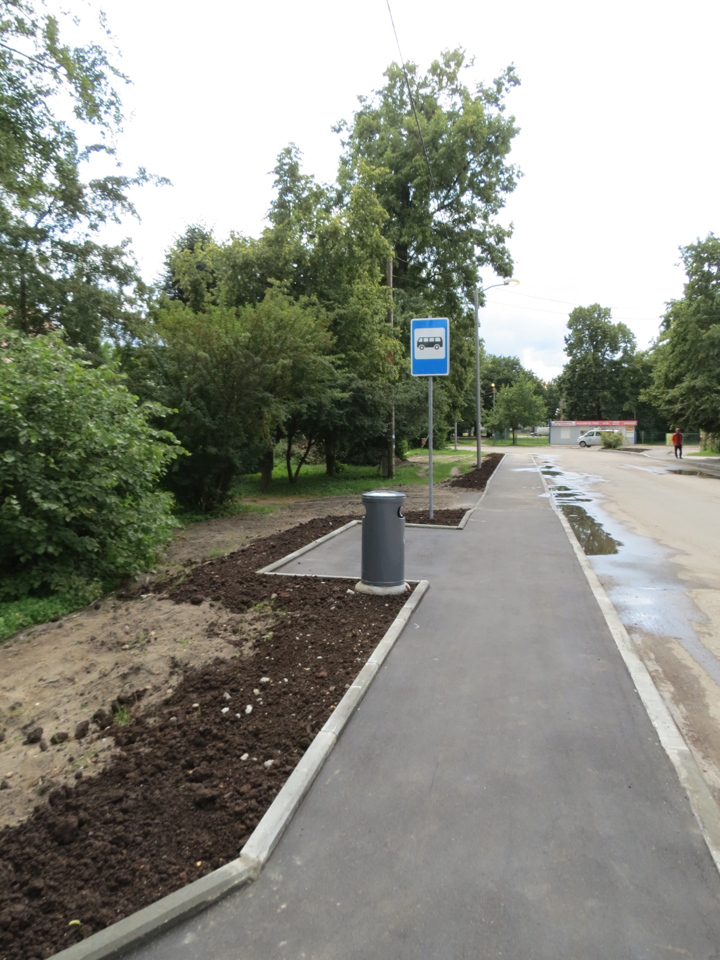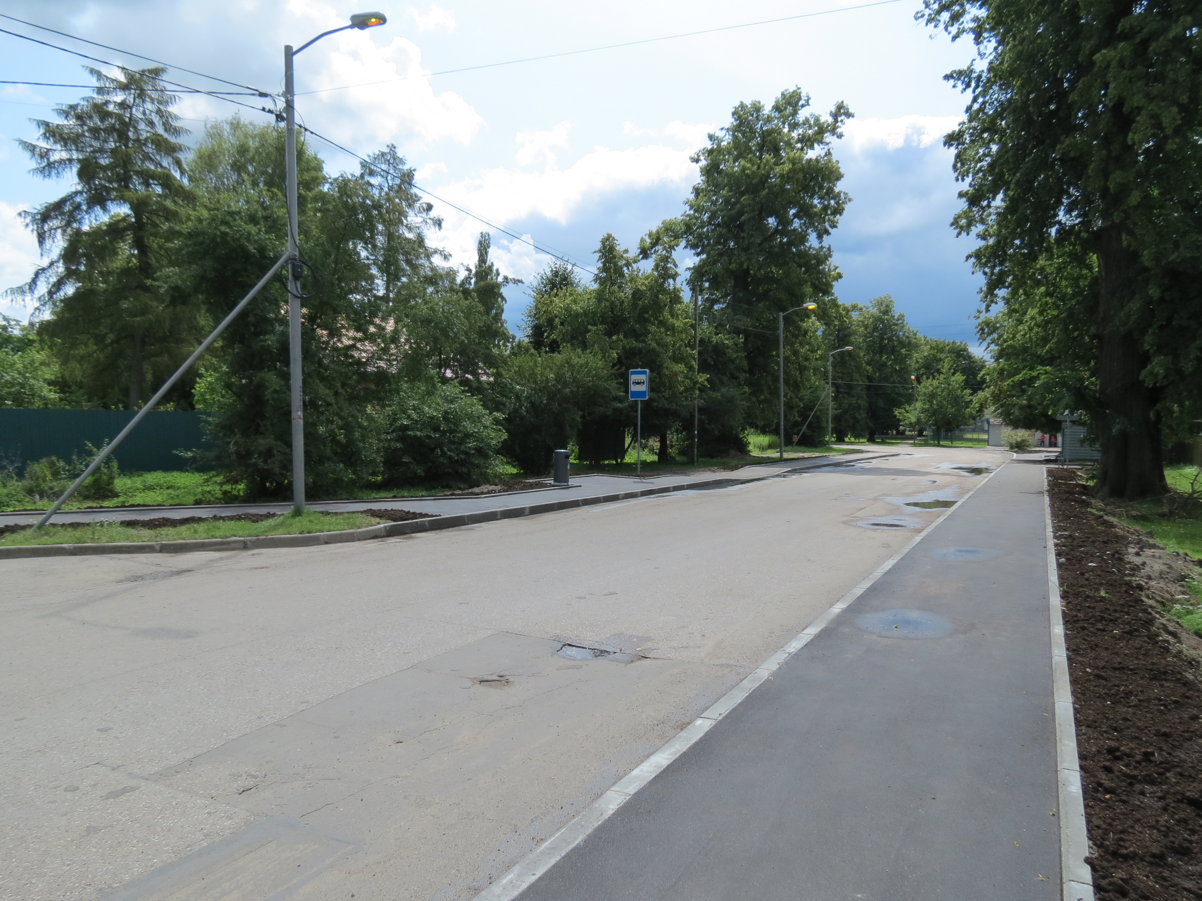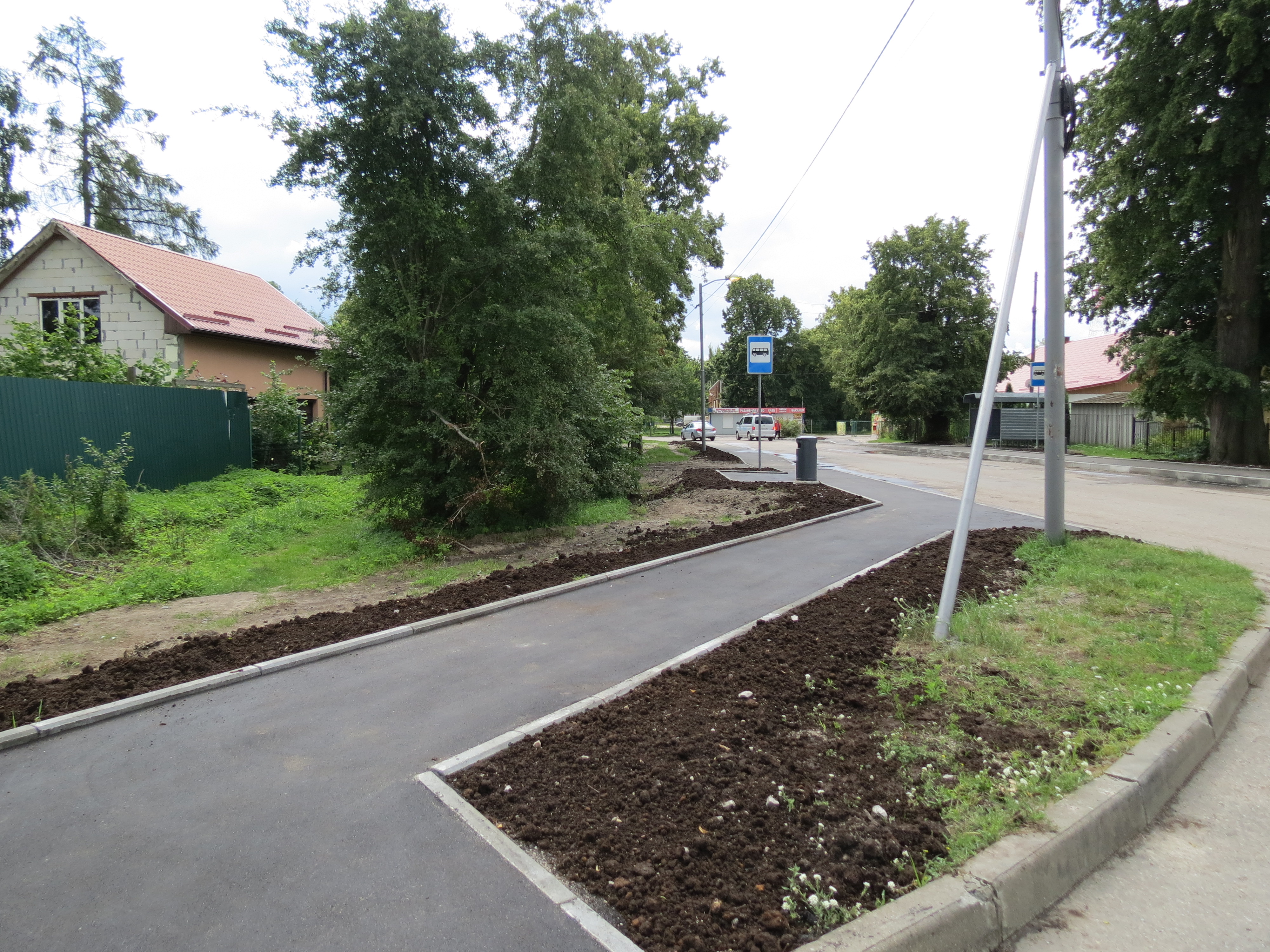 Ремонт другого объекта - тротуара в Прегольском, от д. №15 до д. № 20 и устройство площадки для автобусной остановки напротив д. № 16 вело ООО «Васильковская ДПМК». Общая протяжённость тротуара – более 150 метров. Сегодня он также полностью готов, осталось только посеять газонную траву на огороженных бордюрами зелёных зонах.