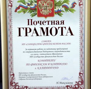Почетная грамота «Сообщества финансистов России» вручена комитету за активную работу по подготовке предложений по совершенствованию бюджетного законодательства. Бюджетный комитет Государственной думы использовал наработки, расчеты и предложения калининградских финансистов в работе над законодательными актами, обязательными для всей страны.