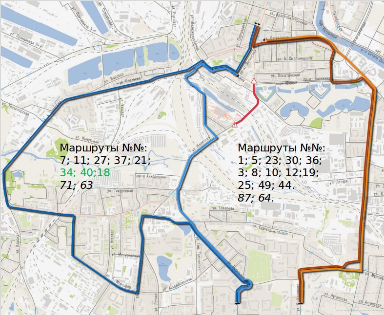 ‑ автобусный маршрут № 34 ‑ по ул. Киевской с разворотом в районе АЗС «Лукойл» (ул. Киевская, 13) и далее в обратном направлении по своему маршруту;