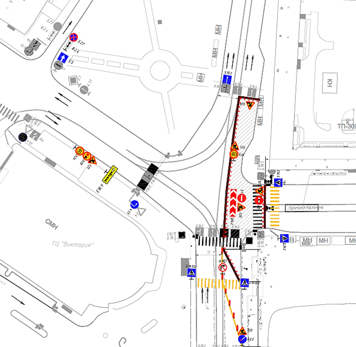 - ограничивается движение транспорта путем сужения проезжей части ул. Киевской от ул. Железнодорожной до пр-кта Калинина;