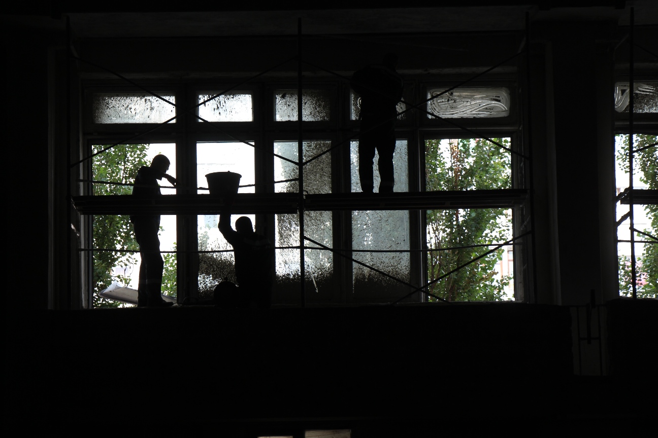 Капитальный ремонт в бассейне начался в середине мая с демонтажа потолочных панелей. При этом профессиональные альпинисты обнаружили надпись «1987» - год постройки корпуса бассейна, открытого в феврале 1990 года. Ремонтники убрали отложения, скопившиеся за три десятка лет, удалили с несущих конструкций коррозию, загрунтовали и покрасили. Декоративные панели также отчищены, отмыты, покрашены и готовы к монтажу.