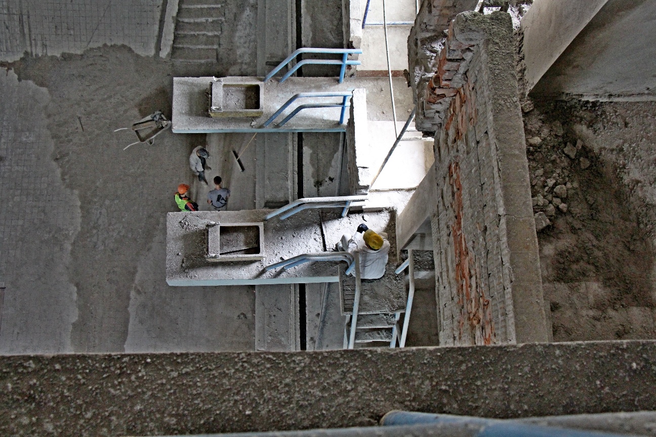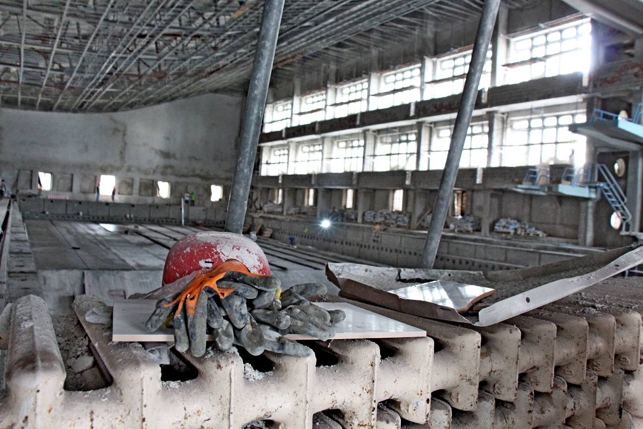 Сейчас рабочие одновременно завершают работы на конструкциях потолка, выравнивают дно и стенки чаши бассейна, штукатурят стены, работают в душевых и раздевалках, а также в узле водоподготовки.