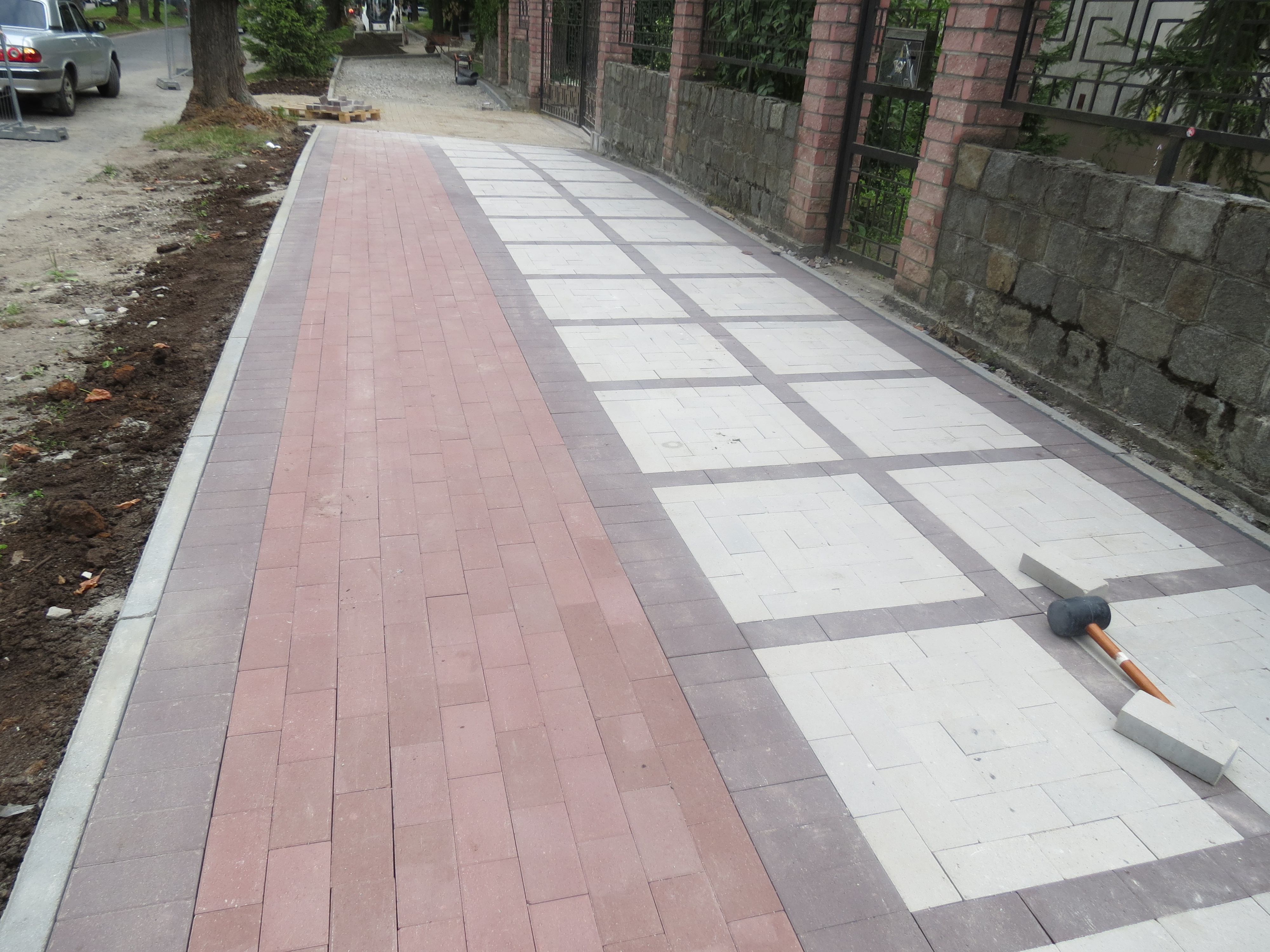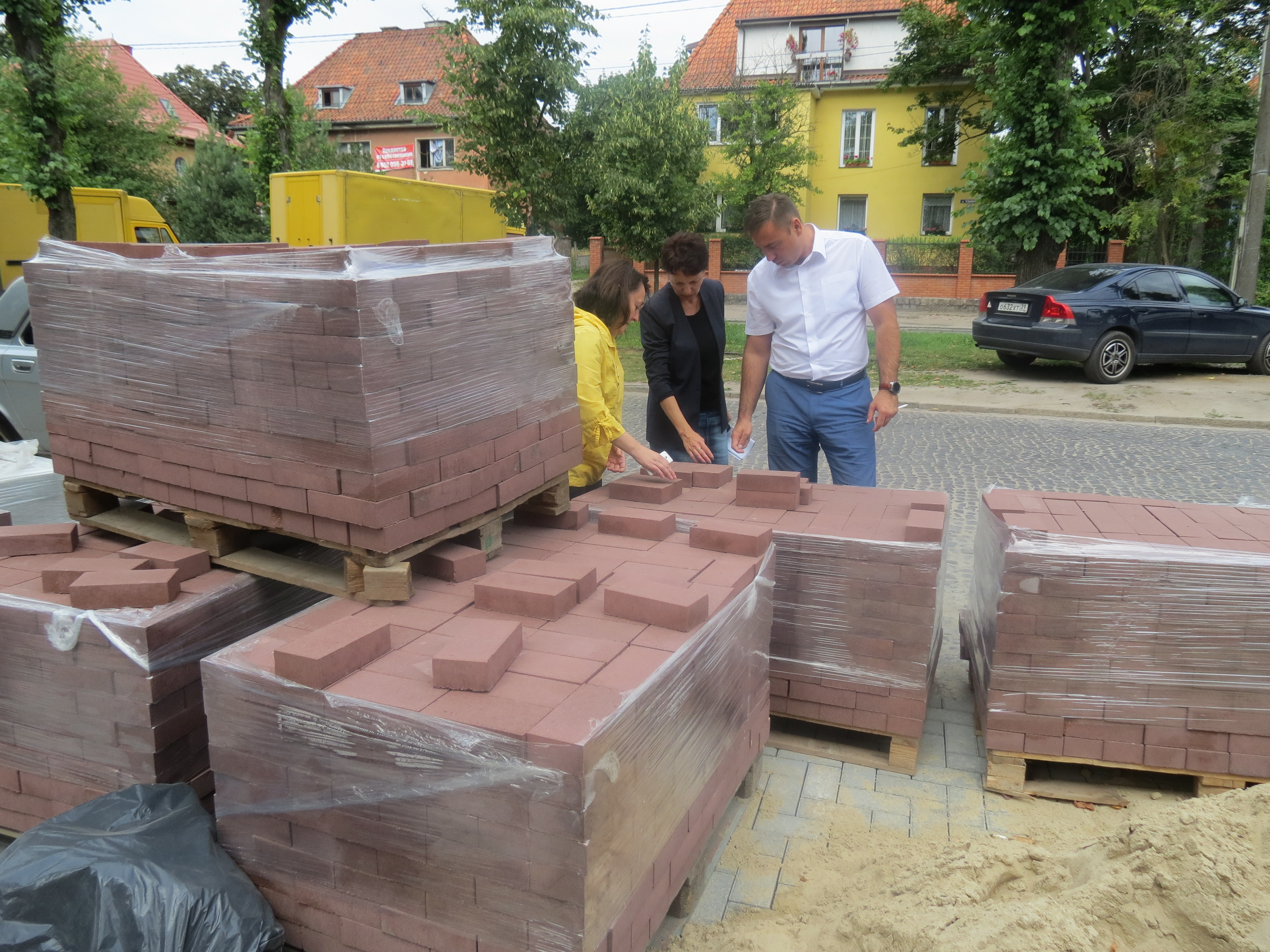 На ул. Тельмана, на всём участке работ, подготовлено основание. Уложена плитка на въездах в дома. Здесь – частный сектор, и хозяева особняков раньше оборудовали въезды на свой вкус. Теперь же всё приведено к одному стандарту. Тротуар будет разноцветным – велодорожка выделена красным цветом, пешеходная зона – в чёрно-белый квадрат. Так что после завершения работ новый тротуар украсит эту историческую часть города.