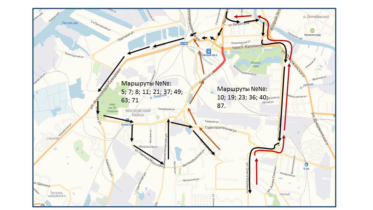 ‑ автобусные маршруты №№ 5, 7, 8, 11, 21, 37, 49, 63, 71 ‑ по пр-кту Ленинскому, ул. Железнодорожной, ул. А. Суворова, ул. Камской, ул. Киевской, ул. П. Морозова, ул. Коммунистической, ул. Судостроительной и далее согласно существующим схемам движения. В обратном направлении ‑ по ул. Киевской, пер. Трамвайному 2-му, ул. Южной, ул. Железнодорожной и далее согласно существующим схемам движения;