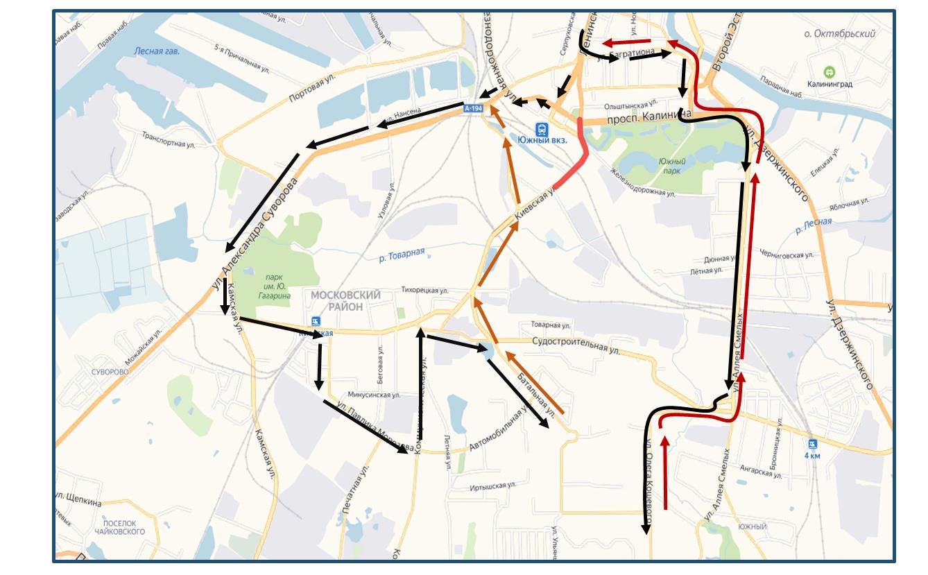 ‑ автобусные маршруты №№ 1, 3, 12, 25, 44, 64 ‑ по ул. Багратиона, ул. Октябрьской, пр-кту Калинина, ул. Дзержинского и далее согласно существующим схемам движения. В обратном направлении ‑ по ул. Дзержинского, ул. Багратиона и далее согласно существующим схемам движения;