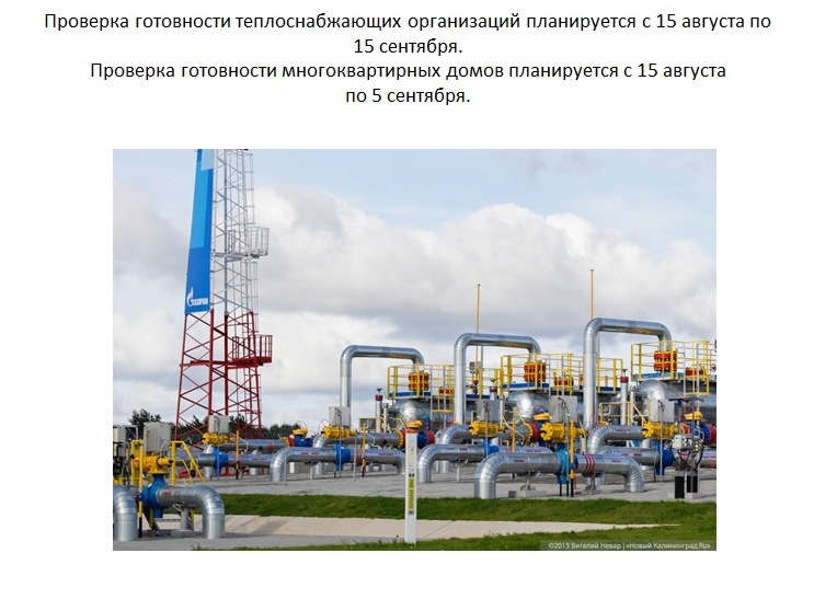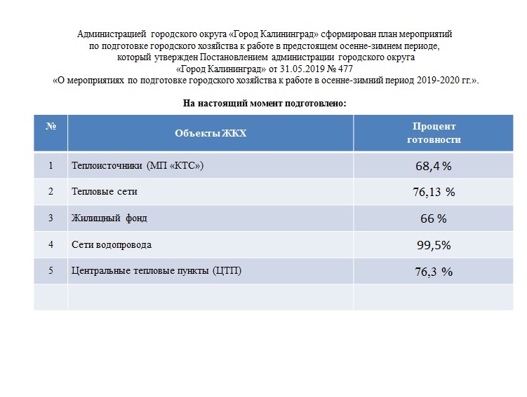 По докладу Александра Купцова, председателя комитета городского хозяйства, подготовка объектов МП «Калининградтеплосеть», в числе которых девять крупных теплоисточников, 76 котельных и 343 километра теплосетей, идёт по графику - это хозяйство обеспечивает теплом и горячей водой 2263 многоквартирных дома.