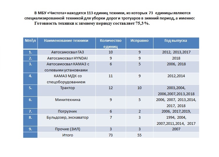 В МБУ «Чистота» находятся 113 единиц техники, из которых 73 единицы являются специализированной техникой для уборки дорог и тротуаров в зимний период. Готовность техники на начало августа составляет 75,3 процента.