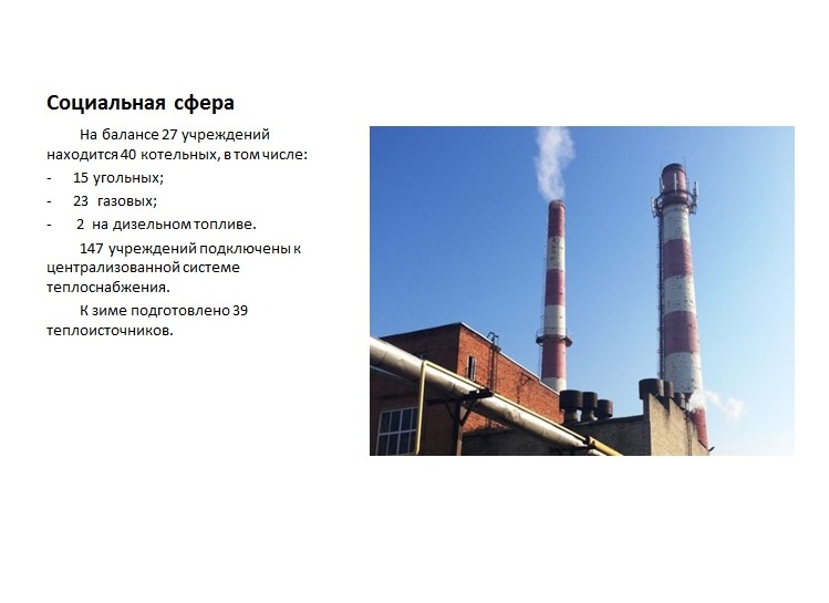 Во всех учреждениях социальной сферы заключены договоры на поставку топливно-энергетических ресурсов и договоры на обслуживание оборудования газовых котельных. Наличие твердого топлива на сегодняшний день составляет 59,0 тонн; дизельного топлива – 4,5 тонны.