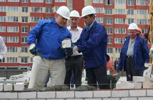 Глава администрации Калининграда Феликс Лапин принял участие в кладке первых кирпичей в стены строящегося детского сада.