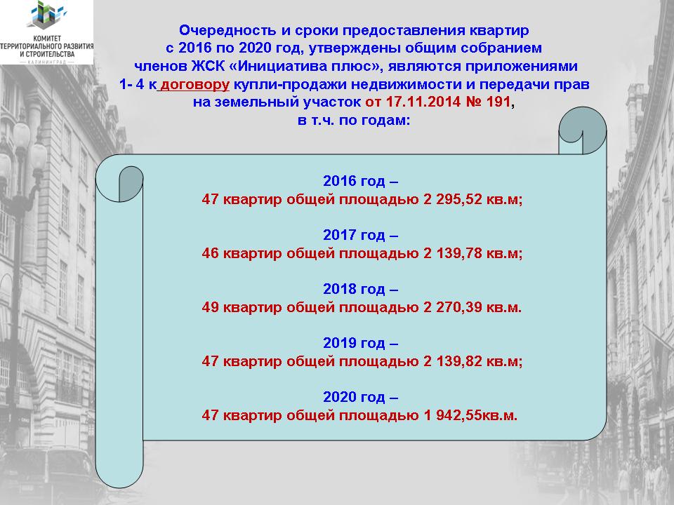 Постановлением возложена обязанность на МКП «УКС» по заключению с ЖСК «Инициатива плюс» договора купли-продажи объекта незавершенного строительства по ул. Генерала Челнокова, 2-8 «А» в г. Калининграде с принятием обязательств по предоставлению 236 жилых помещений (квартир).