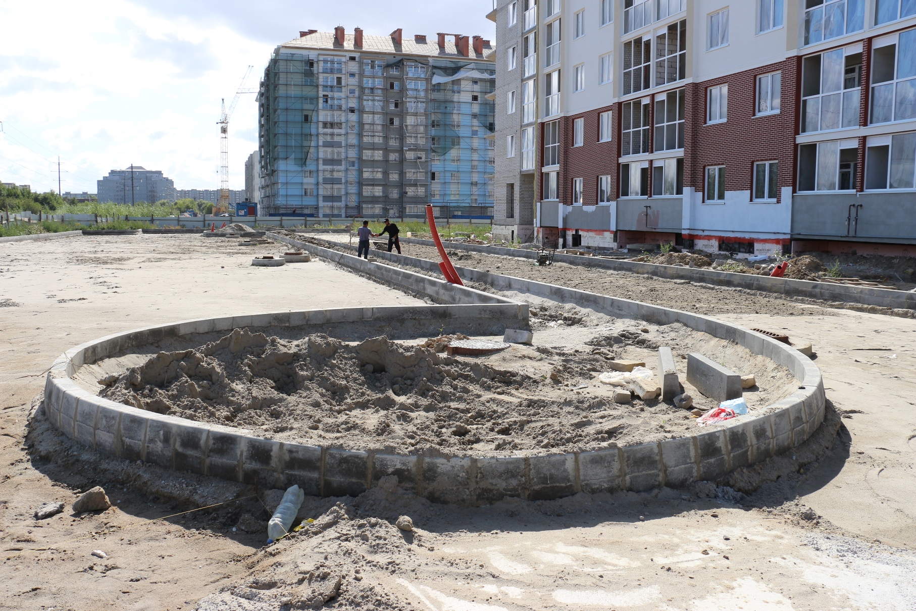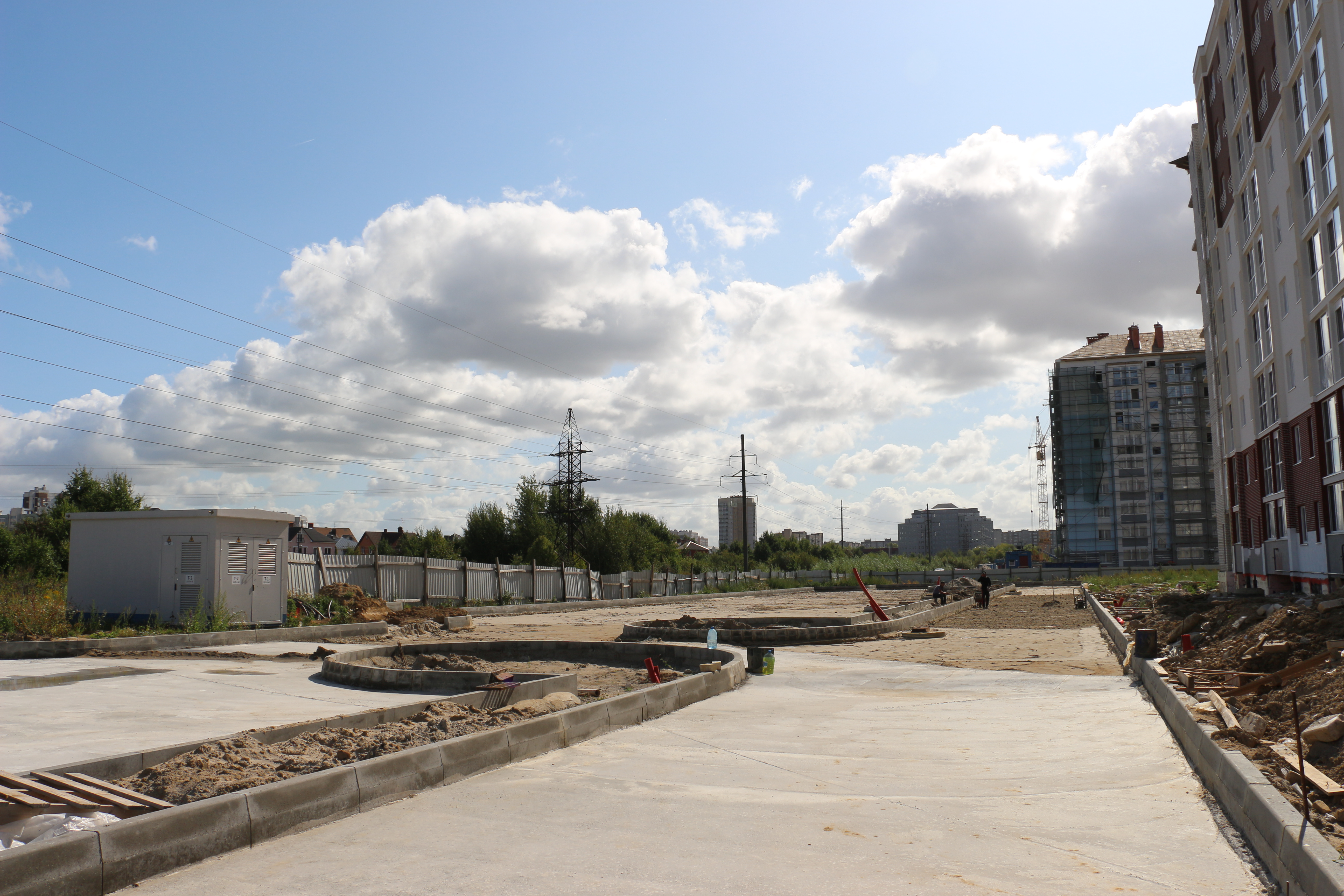 Помимо работ по непосредственно строительству домов подрядчик должен благоустроить и прилегающую территорию. В том числе уже сейчас можно представить, как будет выглядеть автопарковка позади одного из корпусов, ряды на которой предполагается разделить газоном.