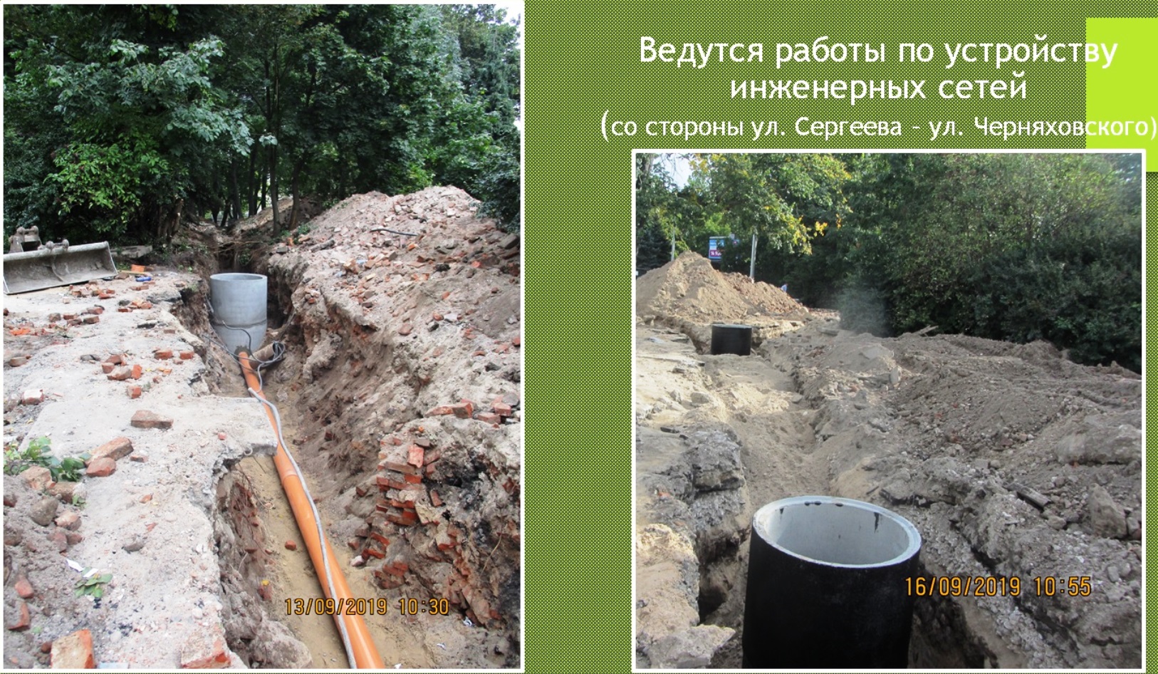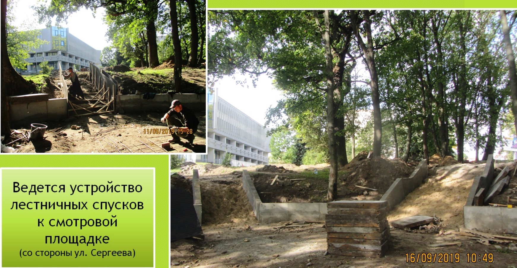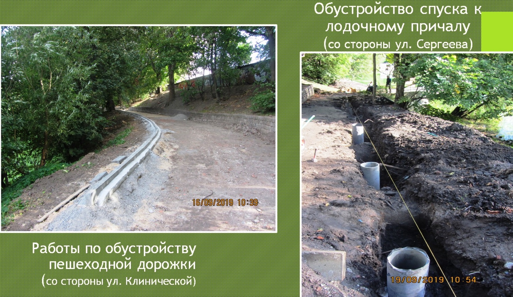 Продолжаются работы по заливке верхней части подпорной стенки (ул. Клиническая, 25а), прокладке сетей ливневой канализации, устройству дренажа вдоль пешеходной дорожки (со стороны ул. Клинической у ликеро-водочного завода), укладываются трубы под кабельные сети наружного освещения со стороны ул. Клинической и со стороны ул. Сергеева, 2 (у Дома профсоюзов). На пешеходной дорожке вдоль Нижнего пруда со стороны ул. Клинической ведутся работы по подготовке песчаного основания, устанавливают бортовые камни. Кроме того, на объекте ведутся работы по резке арматуры для устройства подпорной стенки (ул. Шевченко), а также земляные работы для устройства подпорной стенки (на лодочной станции у Дома творчества детей и молодежи, ул. Сергеева), продолжаются работы по устройству опалубки под заливку лестниц к смотровой площадке по ул. Сергеева.