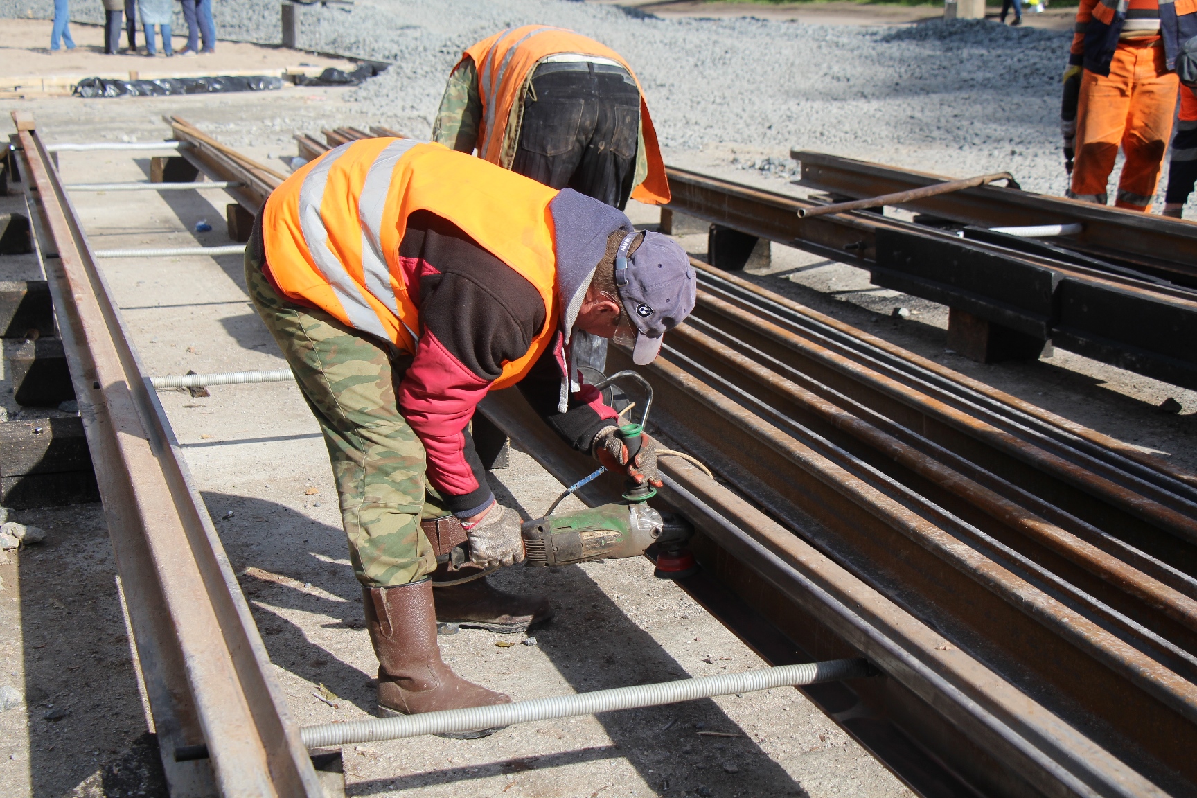 Обстановка здесь меняется практически ежедневно. Сейчас рельсы на готовом основании при выезде из трамвайного депо уже оклеены пористой резиной для снижения вибрации и шума и покоятся на порталах, которые задают нужную высоту. Специфика работ на закруглении путей в том, что требуется скрупулёзная юстировка высоты монтажа рельсов, которые на радиусе прокладываются на разной высоте.
