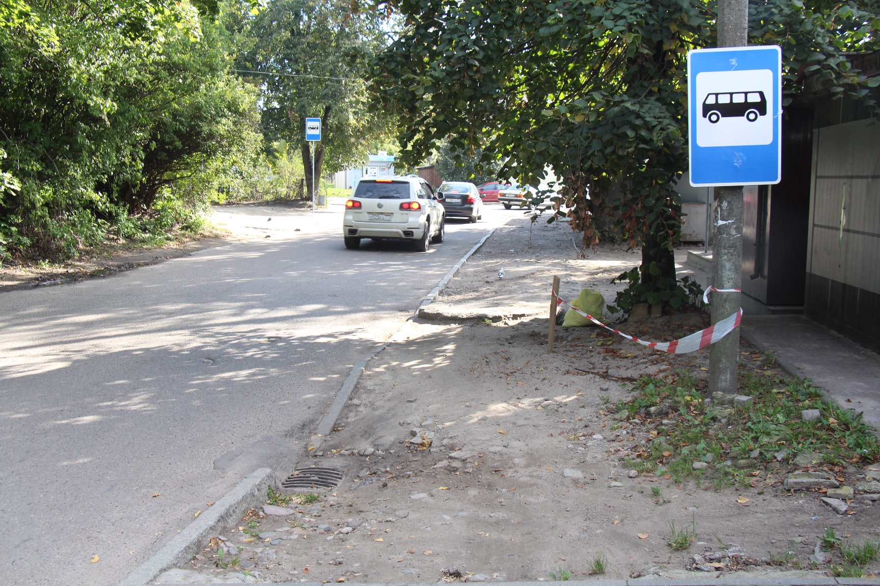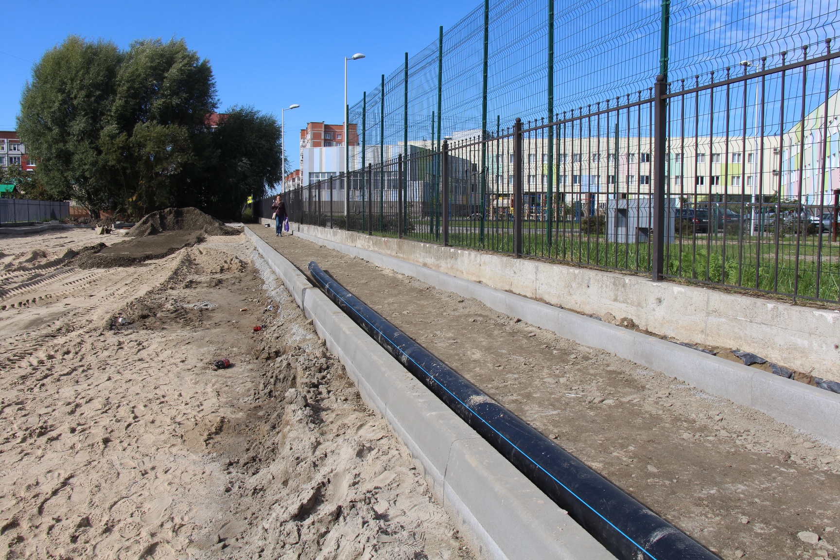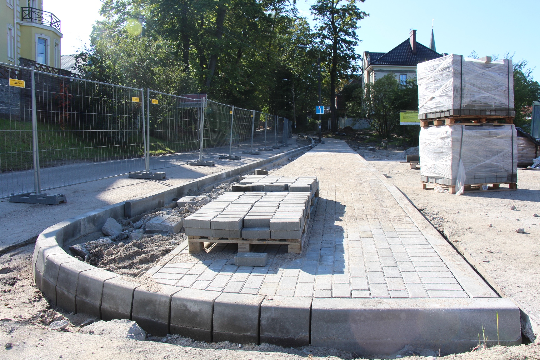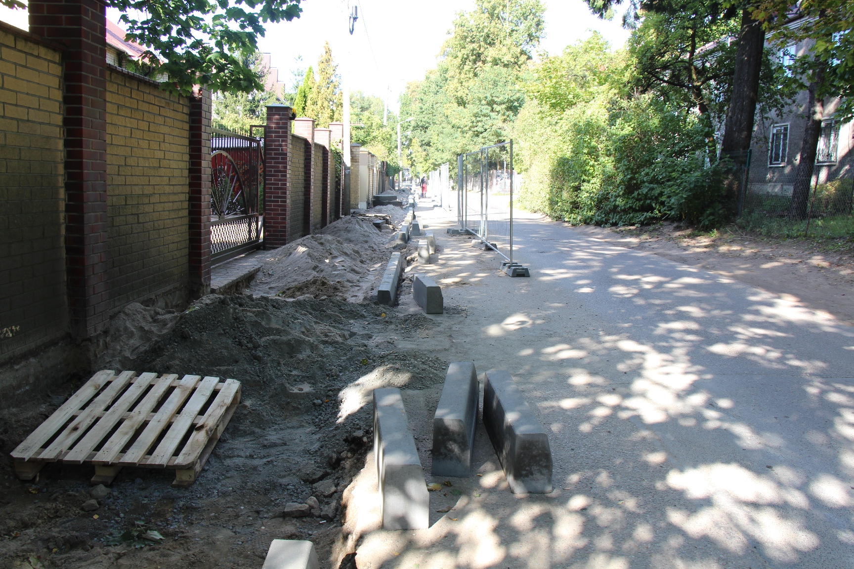 На Тенистой аллее строители установили бортовой камень будущего тротуара и начали выкладывать плитку на подъёме к церкви. Дальше рабочие готовят «корыто» под тротуар вдоль частных домов с обустройством выездов.
