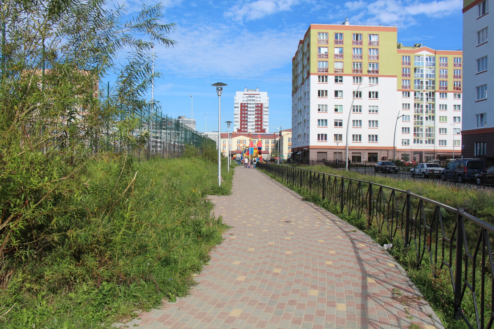 Также в стадии подготовки основание будущей парковки на ул. Карамзина – между школой №56 и новым корпусом детского сада-яслей №57. Тротуар вдоль школьного стадиона уже готов к укладке плитки.