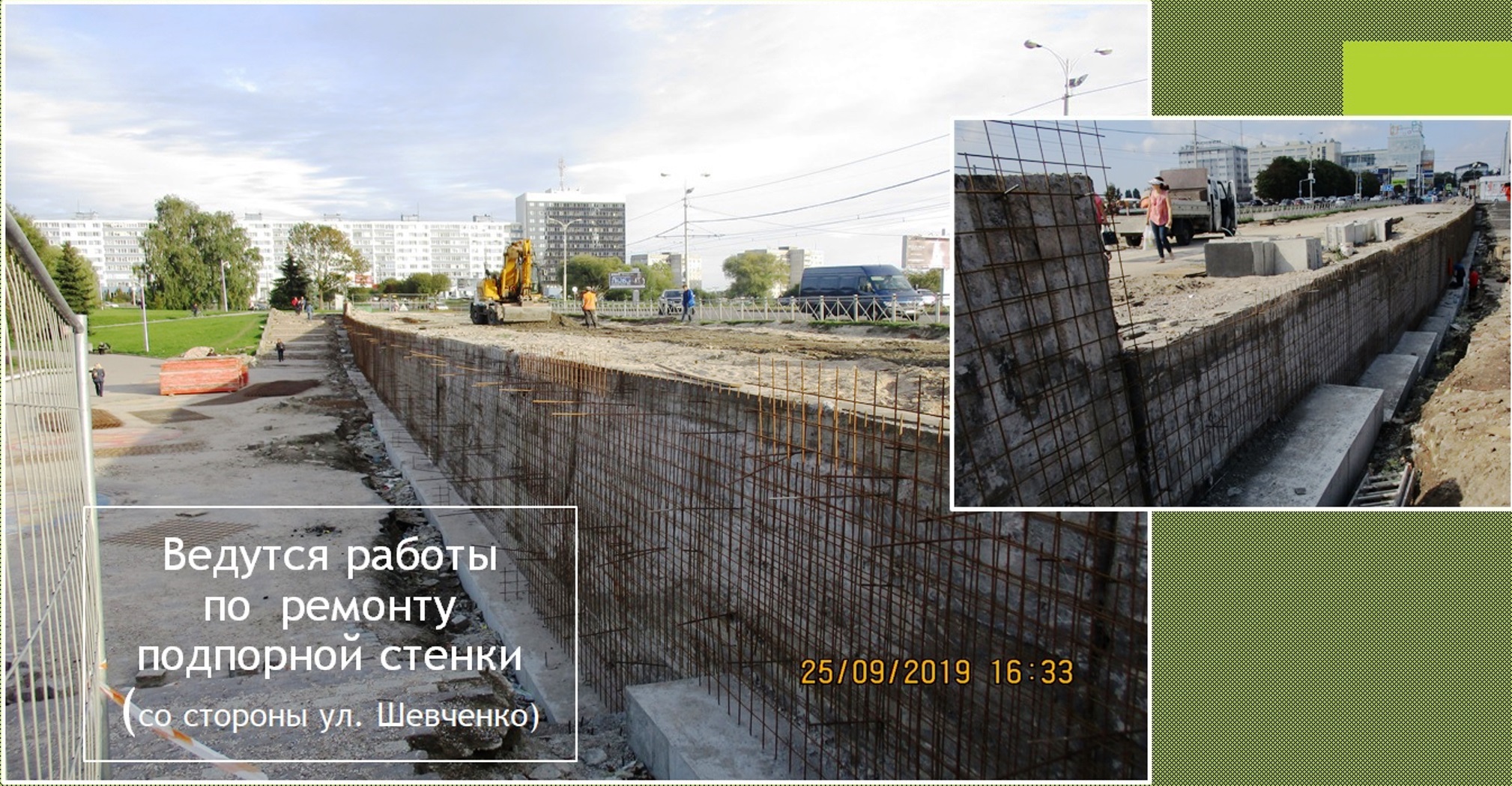 Кроме того, в течение этой недели на набережной Нижнего пруда проводились работы по армированию подпорной стенки и разборке асфальтобетонного покрытия тротуара вдоль ул. Шевченко, а также установка опалубки для подпорных стен на лодочной станции напротив Дома творчества детей и молодежи по ул. Сергеева, продолжаются работы по планировке территории и устройству подстилающих слоев на сквере ул. Сергеева – ул. Черняховского.