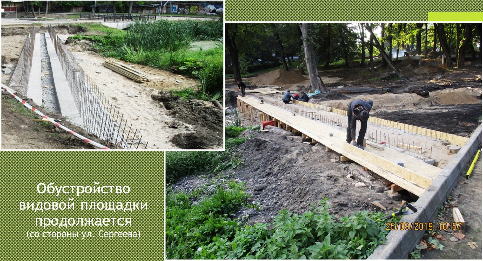 В этом году реализуется второй этап благоустройства в границах улиц Пролетарская, Сергеева, набережная Маринеско, Шевченко. Подрядчик на объекте: ООО «Энергоцентр». На этой неделе на объекте завершены работы по бетонированию ограждения, заливке бетоном лестниц к смотровой площадке на буронабивных сваях со стороны ул. Сергеева, ведутся работы по устройству подстилающих слоев и опалубки подпорных стен ограждения на двух других лестницах. Продолжаются работы прокладке сетей ливневой канализации со стороны ул. Сергеева - ул. Черняховского, устройство дренажа вдоль пешеходной дорожки со стороны ул. Клинической у ликеро-водочного завода, подготовка основания из песка на пешеходной дорожке вдоль Нижнего пруда со стороны ул. Клинической и в районе Дома профсоюзов со стороны ул. Сергеева.