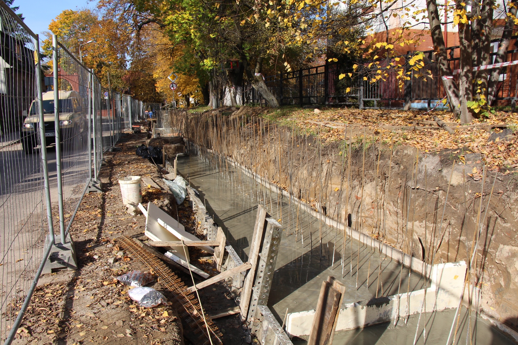 На Тенистой аллее плитку уложили от самого низкого участка до церкви и дальше, вдоль особняков, где въезды и тротуары долго согласовывали с владельцами. Сейчас дорожные строители заливают бетоном подпорную стенку на повороте у начальной школы №19 и готовят основание под продолжение тротуара в сторону ул. Менделеева.