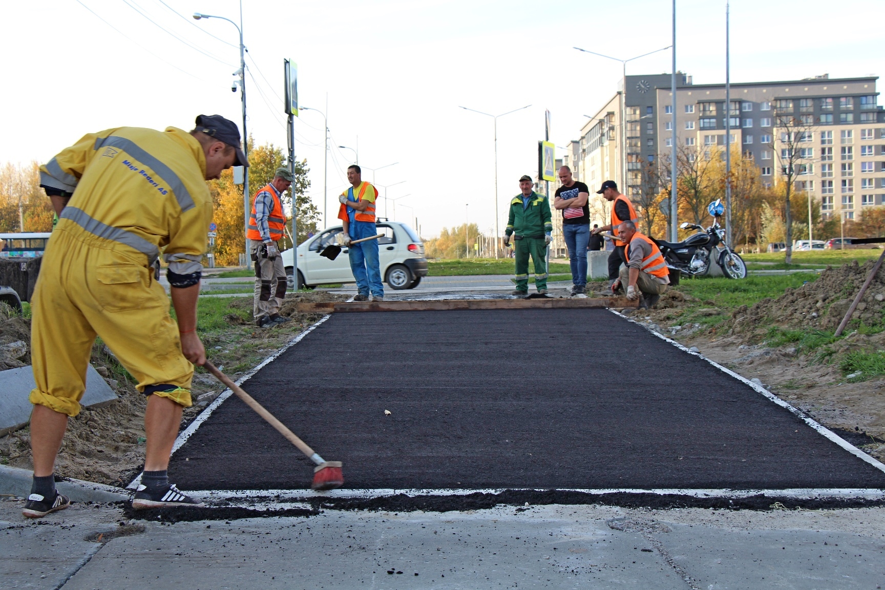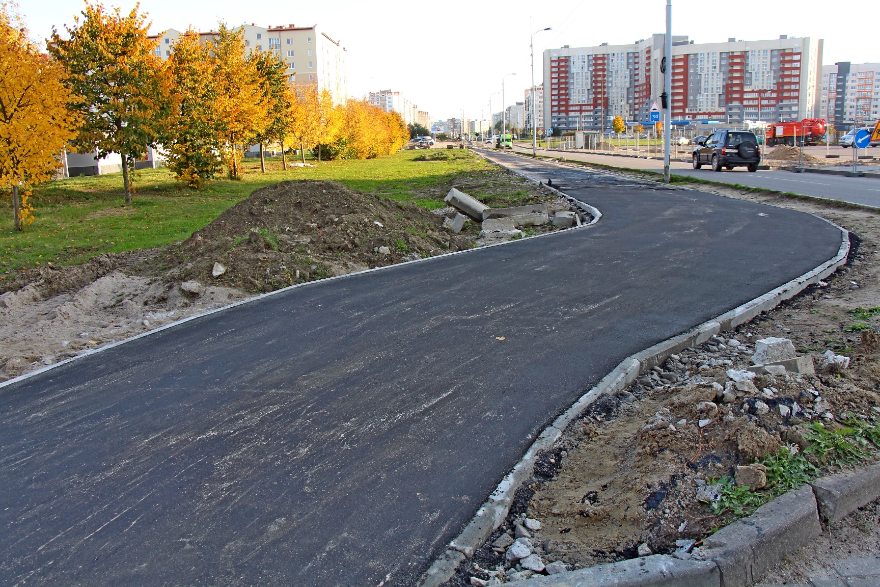 На улице Согласия пешеходы уже освоили свежий тротуар у будущей парковки рядом с новым корпусом детского сада №59. Ещё один прямой отрезок широкой пешеходной дорожки до Рассветного переулка закатали асфальтом после обеда. Завтра дорожники рассчитывают положить асфальт на тротуары у поворота с ул.Согласия на ул. Петра Панина, в том числе на подходы к пешеходному переходу на кольце. Затем приступят к обустройству парковки, которую прямо по слою щебня уже освоили автомобилисты.