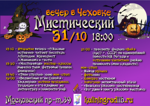 Человечество испокон веков притягивает неизвестное, загадочное, окутанное флёром ужаса и мистики. Писатели, живописцы, режиссеры обращаются к этой неисчерпаемой теме снова и снова. Почему каждый из нас чего-то боится? Можно ли преодолеть свои фобии? «Чеховка» и культурный кластер «Кварт» (Молодежный центр Калининграда) приглашают встретиться вечером 31 октября, чтобы узнать историю и истоки «ужасных» праздников, послушать свежесочиненные страшилки и отрывки из тематической классики, принять участие в мастер-классах и конкурсах. А самое главное, на нашем вечере будет весело, музыкально и познавательно.