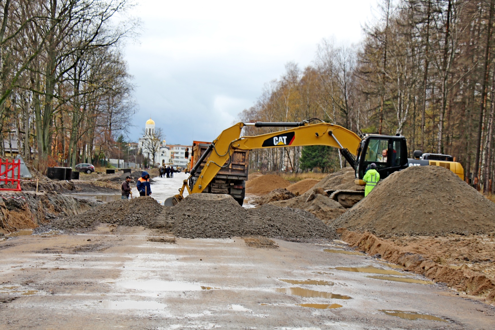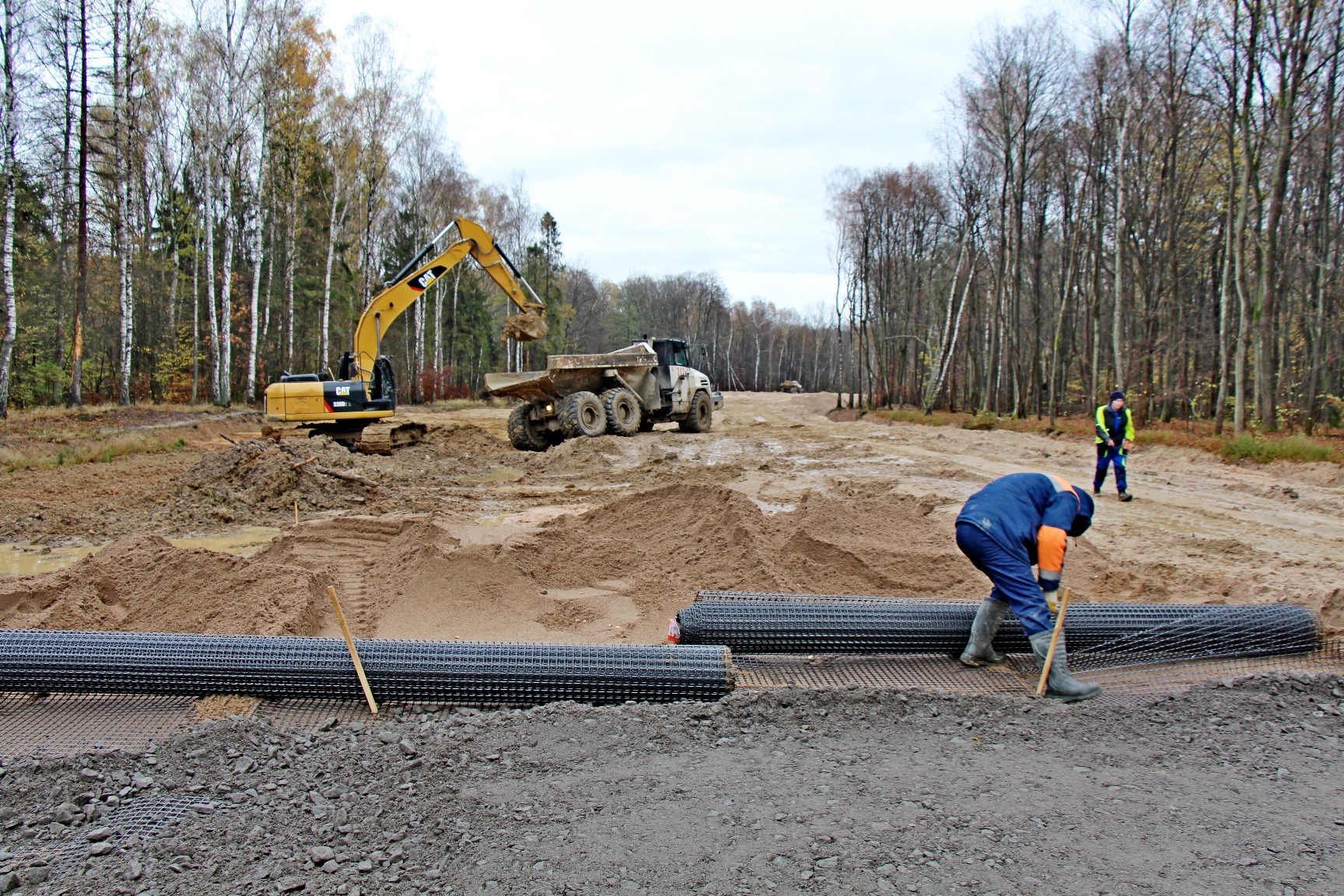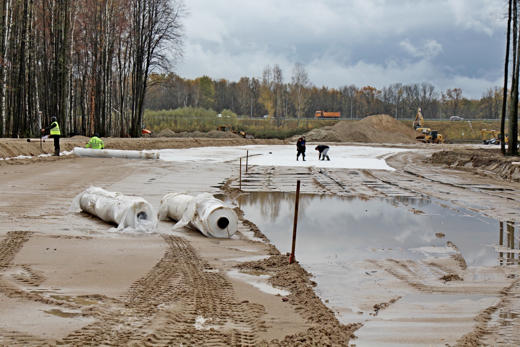 Тем временем на объекте соединились две части будущей дороги, это облегчает подвоз материалов. Насыпь растёт и в высоту, между слоями песка прокладывают фильтрующий слой геотекстиля, съезд с Окружной дороги уже приобрёл свои проектные очертания.