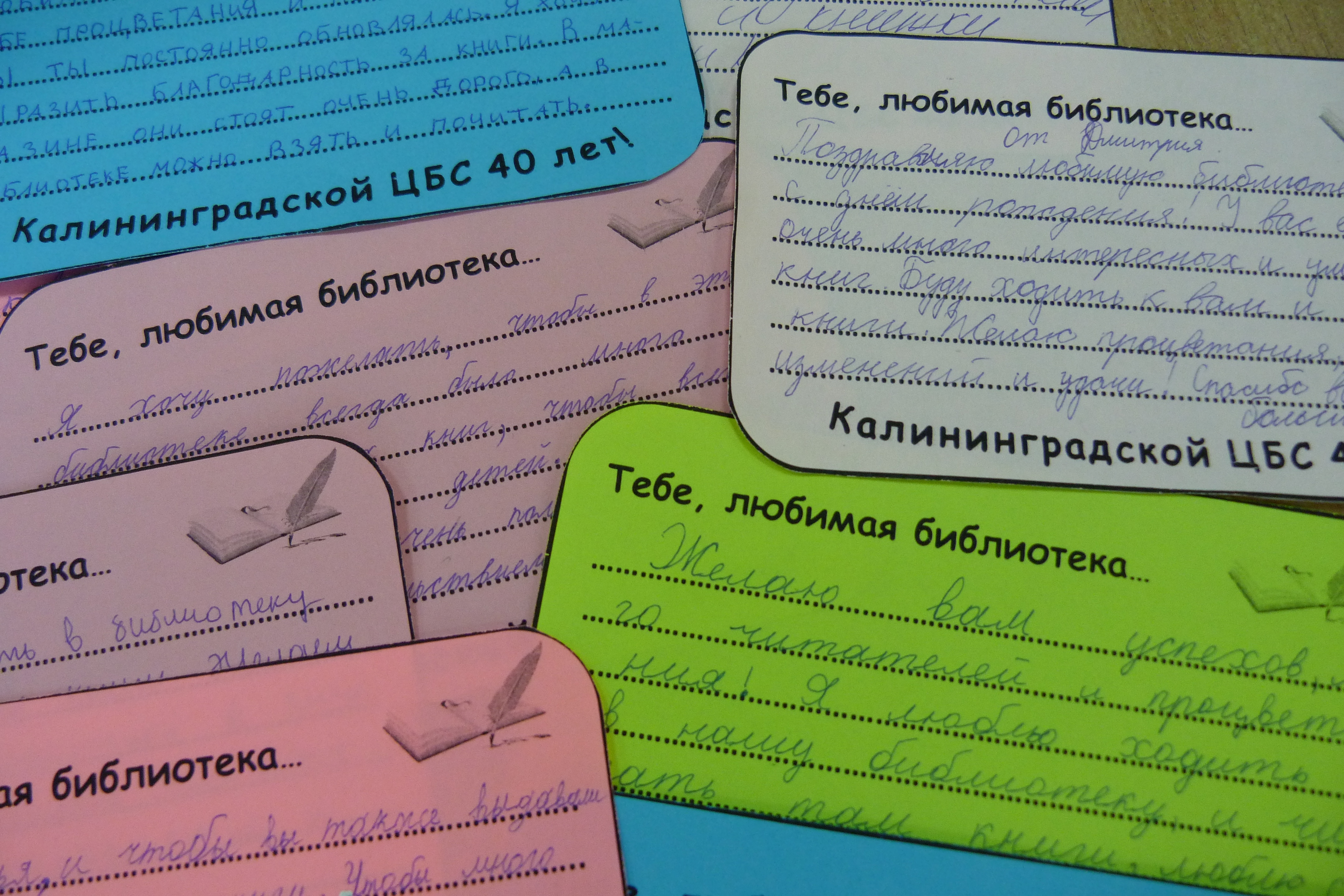 В честь юбилея сотрудники отделов обслуживания обратились к своим читателям с предложением написать несколько слов о том, что для них сегодня значит библиотека. Посетители откликнулись очень активно, в ящичке для пожеланий оказалось более 70 ярких поздравительных бланков. В акции приняли участие читатели разных возрастов. Самым юным оказался Всеволод Нехаев (4,5 года), который собственноручно написал поздравление с Днем рождения Калининградской библиотечной системе. Постоянная читательница Татьяна Ерощенкова, классный руководитель начального класса, порадовала библиотекарей поздравлением в стихотворной форме.