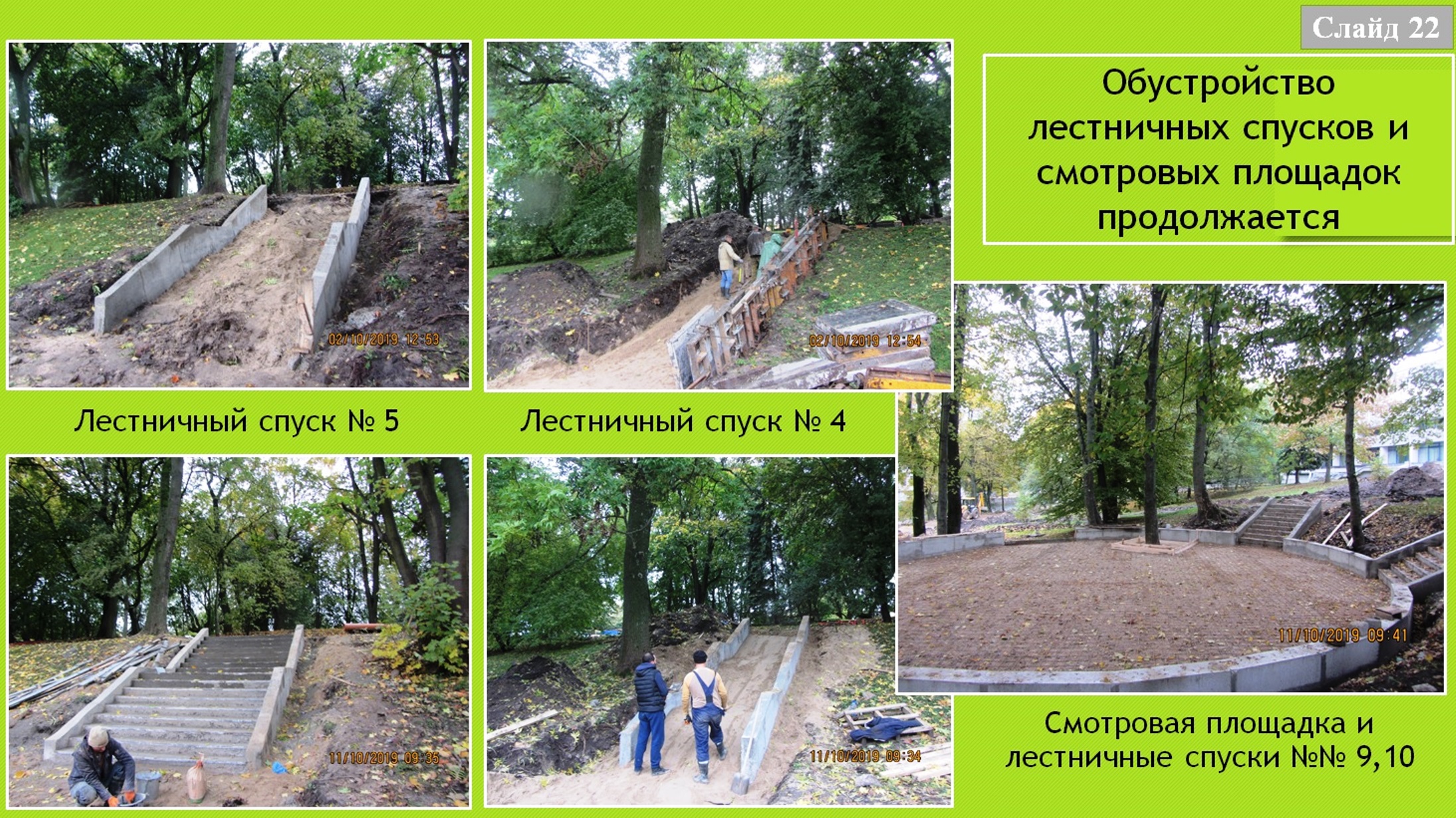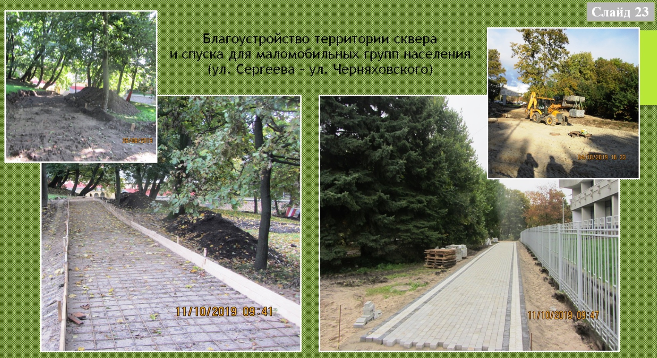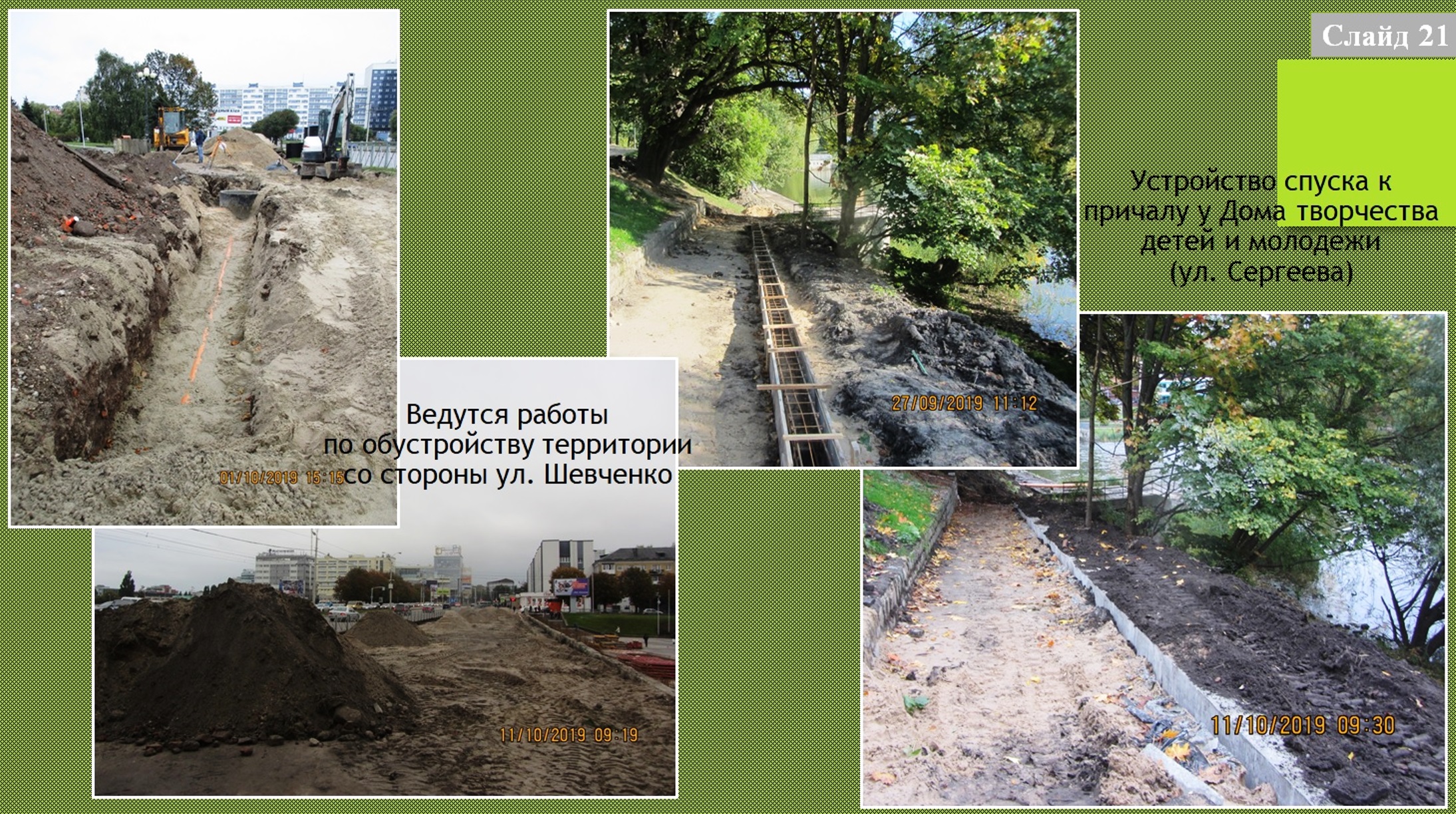 Благоустройство набережной Нижнего пруда организовано в границах улиц Пролетарская, Сергеева, набережная Маринеско, Шевченко. В период с 8 по 14 ноября здесь проводились работы по обустройству двух общественных туалетов (со стороны ул. Клинической у ГТРК «Калининград» и на ул. Сергеева), укладка подстилающих слоев на детской площадке по ул. Клиническая, мощение тротуарной плитой на ул. Шевченко – ул. Пролетарская. Был завезен грунт в сквер по ул. Сергеева – Черняховского. Продолжаются работы по обустройству лестничного спуска с ул. Сергеева, установлено более 200 опор уличного освещения. Завершена укладка тротуарной плитки на пешеходных дорожках в сквере ул. Сергеева – ул. Черняховского, бетонирование пешеходной тропы, доступной для маломобильных групп населения (спуск с ул. Сергеева), а также пешеходной дорожки со стороны ул. Клинической.
