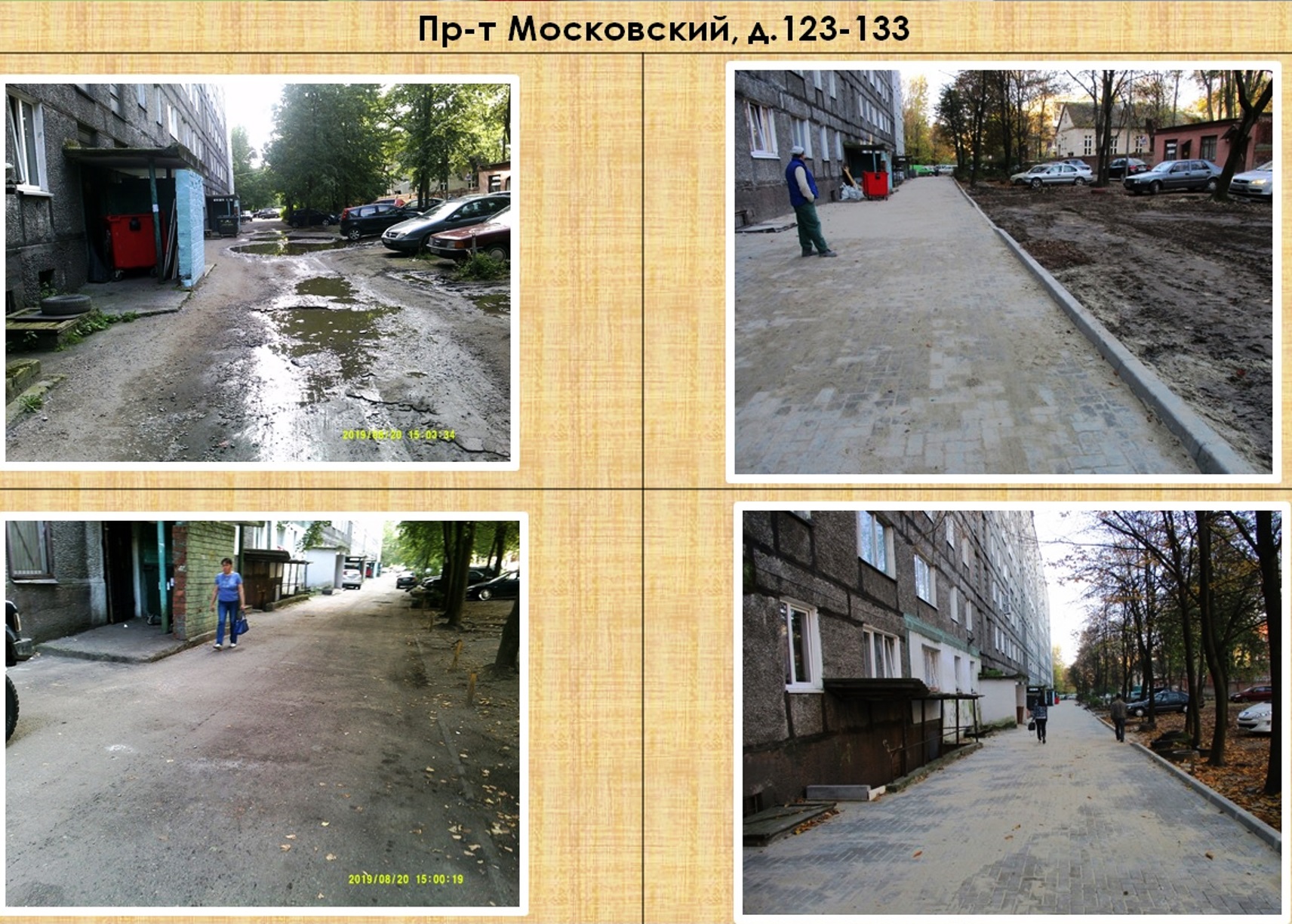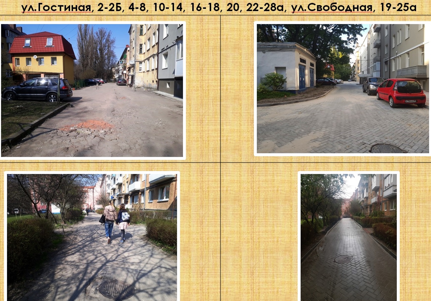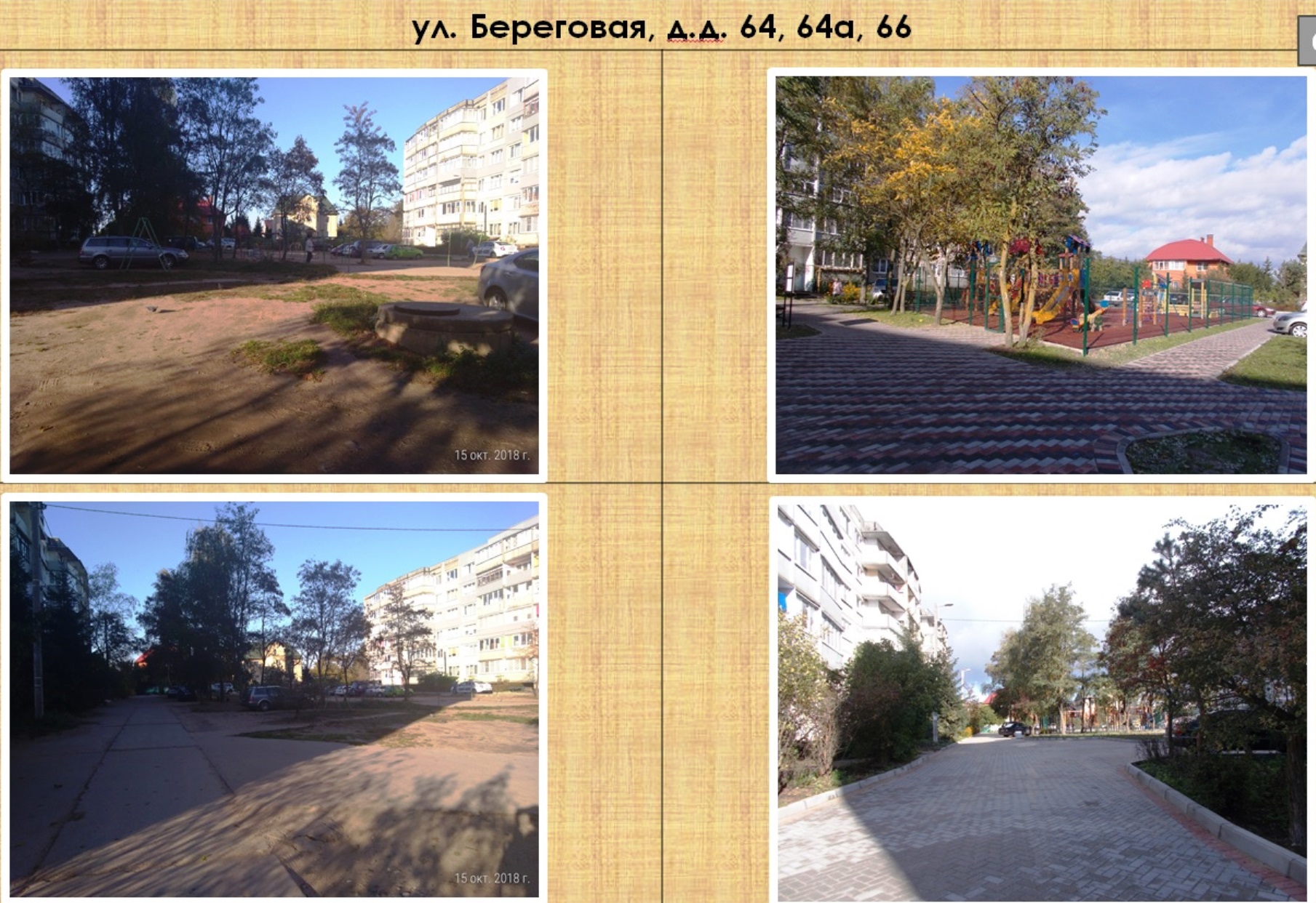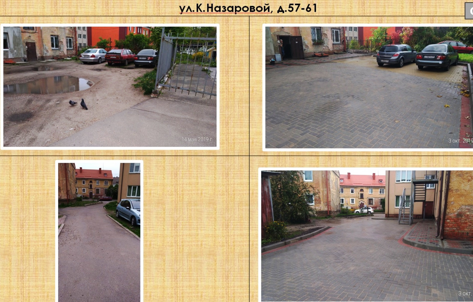 План благоустройства дворовых территорий выполнен на 90 %. На сегодняшний день работы завершены и оплачены на 11 из 13 объектов. В приемке дворов после ремонта принимают участие представители общественной организации инвалидов – АНО «Экспертный центр добровольной сертификации «Калининград», доступный для всех». Они побывали на всех 11 завершенных объектах вместе с приемочной комиссией, и проверили доступность среды для маломобильных групп населения.
