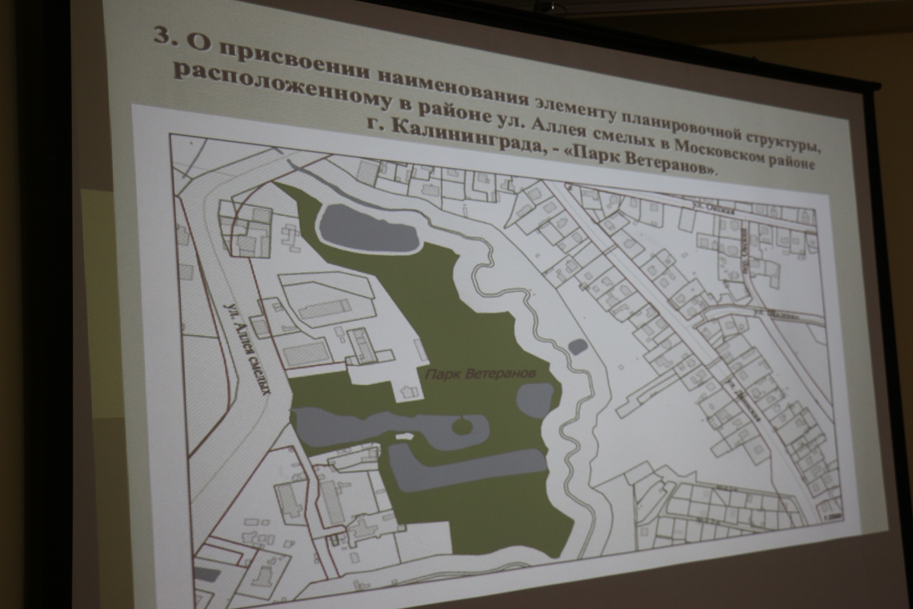 Окончательные решения по присвоению топонимов принимает городской Совет депутатов Калининграда. Если представители горсовета поддержат решение топонимической комиссии, то вскоре в Московском районе областного центра Калининграде появятся три новых переулка Волгоградский, Липецкий и Курский. А большая зеленая территория близ Аллеи Смелых станет называться «Парком Ветеранов», инициатива присвоения такого топонима принадлежит калининградской общественной организации – фонду социальной поддержки ветеранов-строителей.