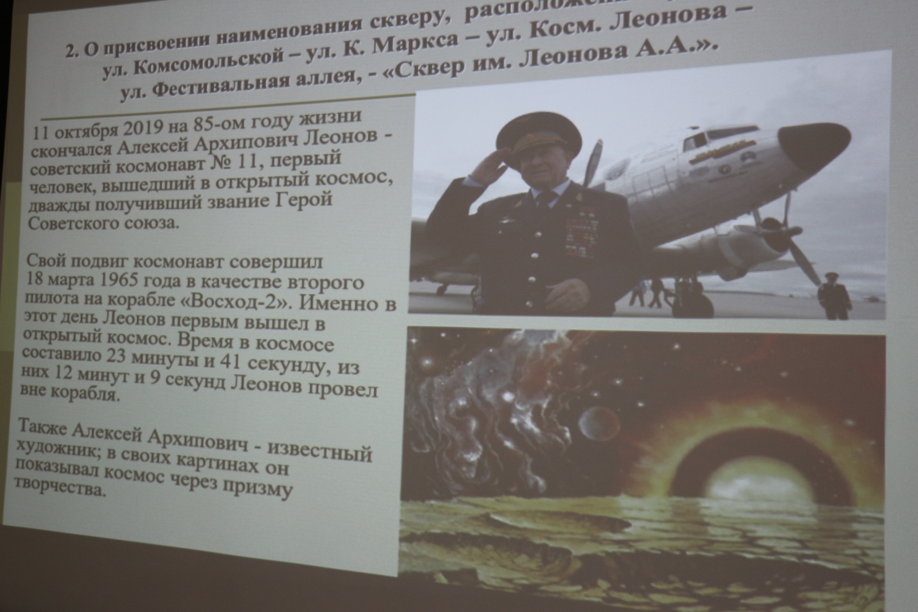 Единогласны же были члены комиссии при принятии решения о присвоении небольшому скверу в Центральном районе расположенному в границах Фестивальной аллеи и улиц Комсомольской – К. Маркса – Космонавта Леонова –имени Алексея Леонова. Целесообразно и логично дать этому скверу имя нашего известного земляка, почетного гражданина Калининграда. Но по положению о топкомиссии это возможно сделать, спустя пять лет после смерти человека, имя которого предлагается увековечить в элементах планировочной структуры. Поэтому, если не примут иного решения депутаты горсовета, то по истечении положенного срока сквер официально получит имя российского космонавта. При этом уже сегодня никто не мешает благоустраивать территорию с учетом его будущего названия и тематики.