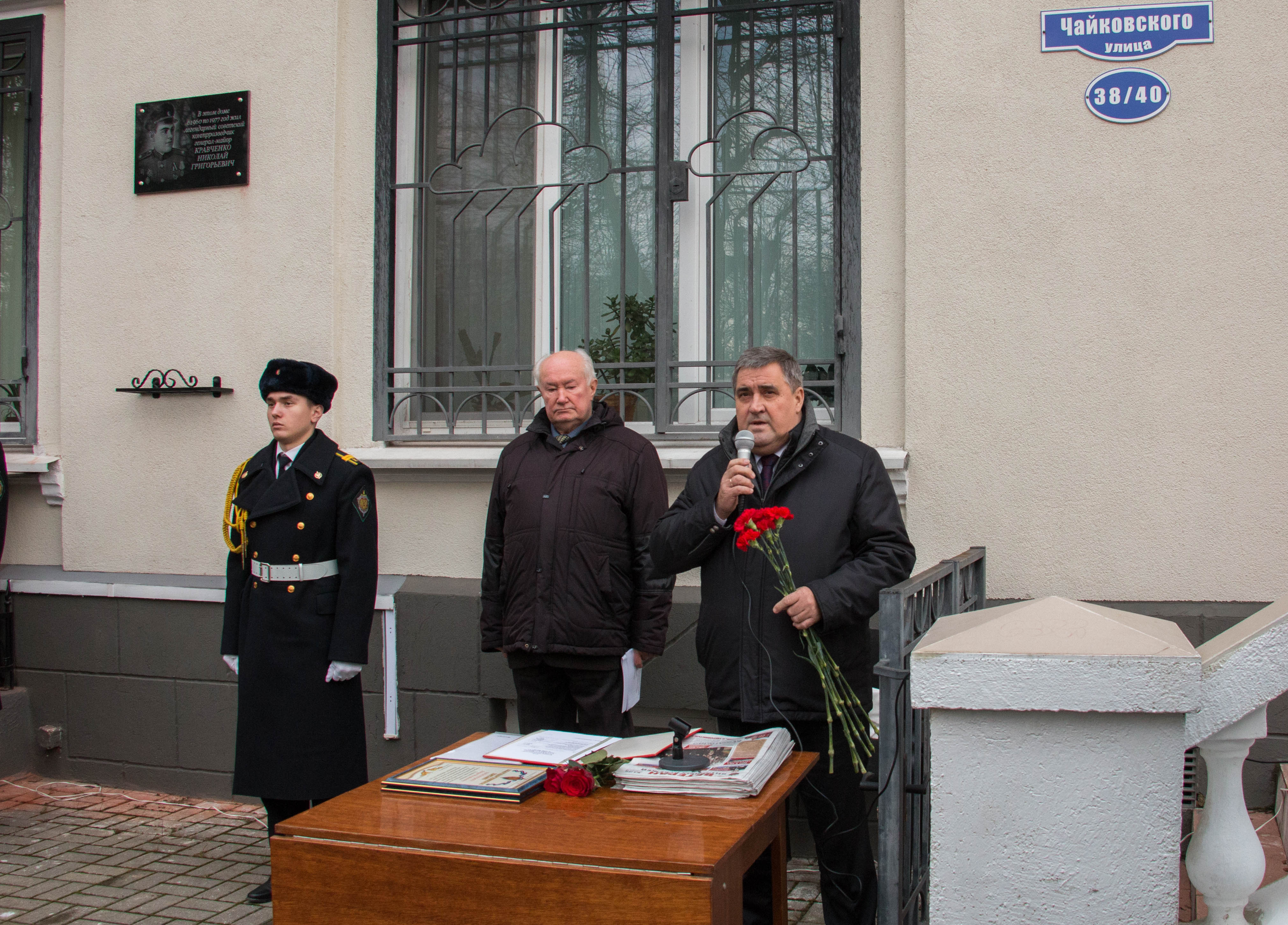 Сегодня, 18 декабря 2019 года, в торжественной обстановке открыта мемориальная доска в честь легендарного советского военного контрразведчика генерал-майора Кравченко Николая Григорьевича на фасаде дома № 38-40 по ул. Чайковского.