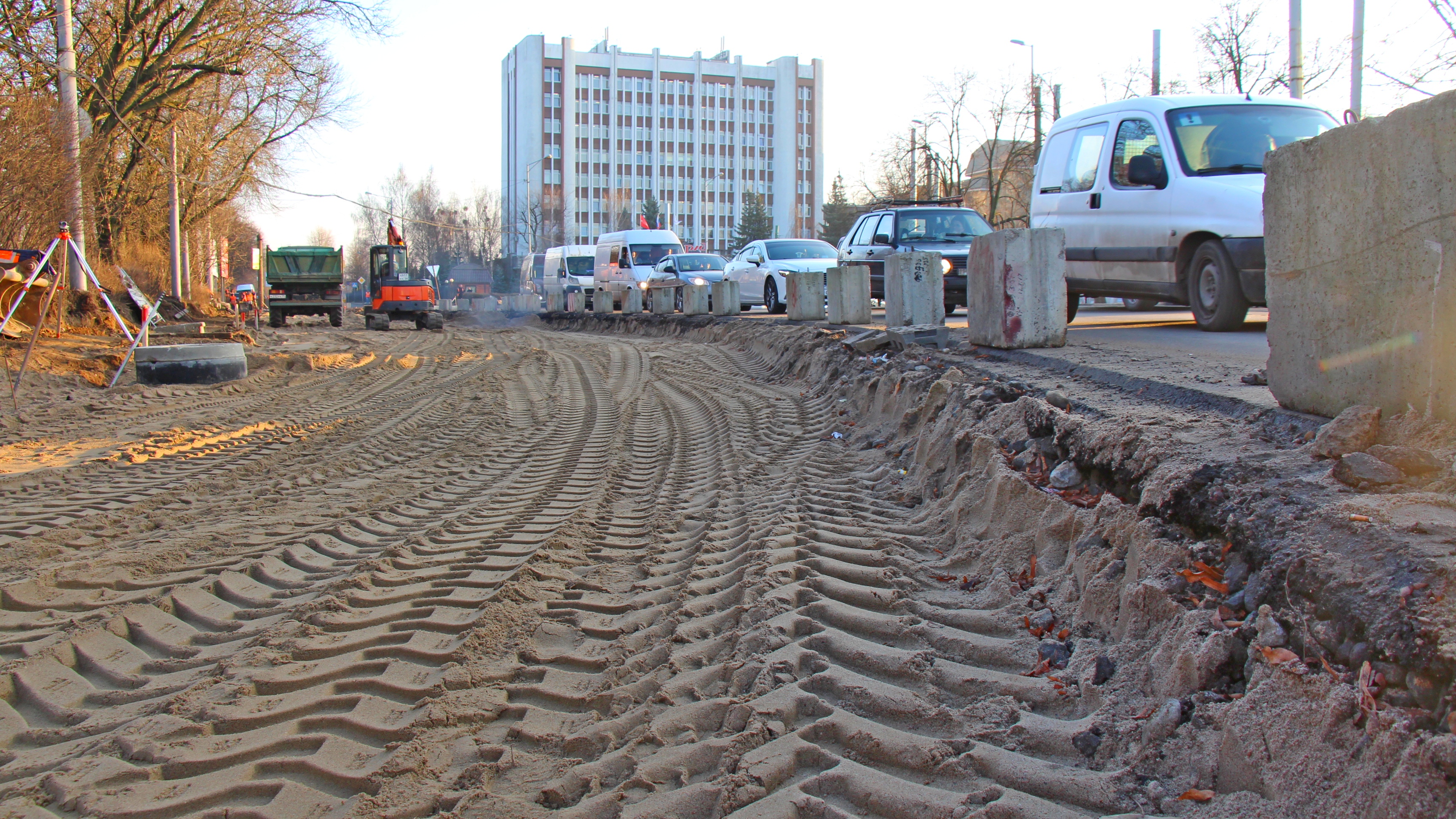 Работы на объекте продолжаются без отставания от графика. Сейчас на полосе, по которой ехал транспорт во время перекладки трамвайного полотна и капремонта проезжей части, отсыпают и уплотняют песчаное основание, устанавливают дождевые колодцы и бортовой камень, завозят щебень.