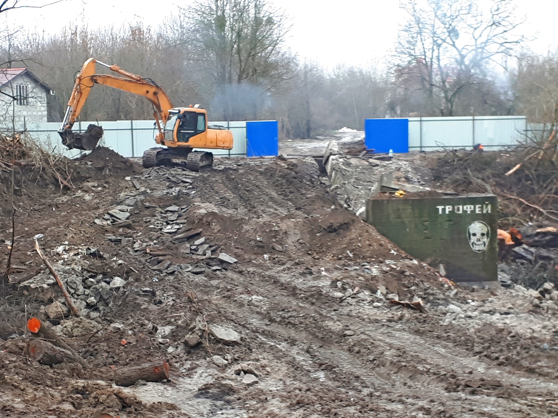 Аварийный мостик уже демонтировали, две его арки сложили за пределами площадки. В русло ручья уложили временную трубу, так что вода по-прежнему проходит, не угрожая подтоплением.