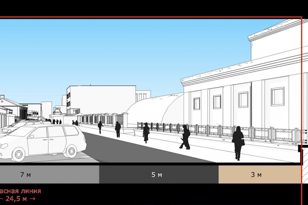 Концепция пешеходной зоны на улице Баранова предусматривает возможность разгрузки служебного транспорта на территории от торгового центра «Кловер» до ул. Иванникова, сохранение въезда в паркинг гостиницы «Рэдиссон». На участке от ул. Партизанской до ул. Пролетарской тоже предлагается часть улицы выделить под автомобильное движение.