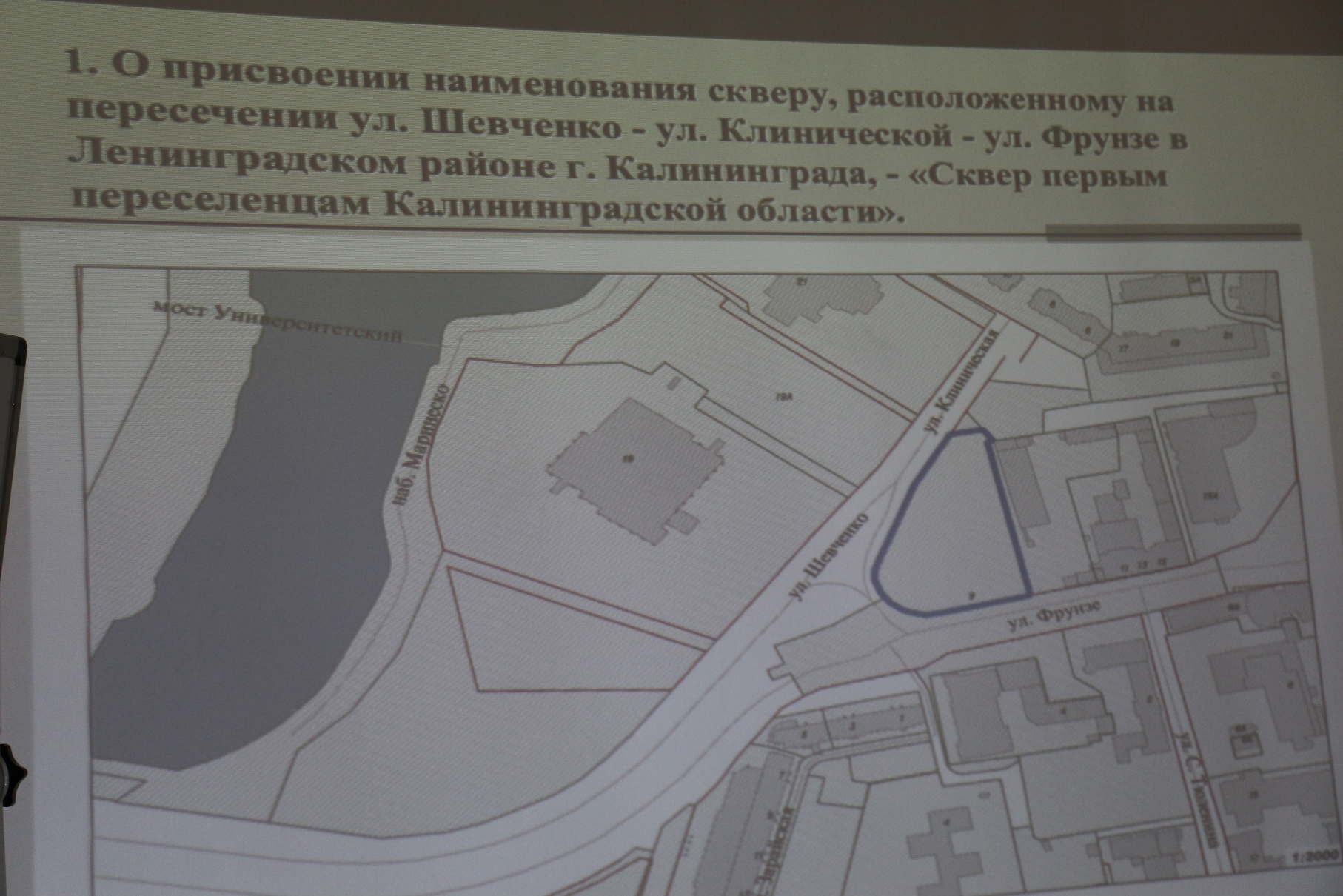 - Решение № 140 от 03.07.2019 «О присвоении наименования скверу, расположенному в Ленинградском районе города Калининграда, - сквер «Первым переселенцам Калининграда».