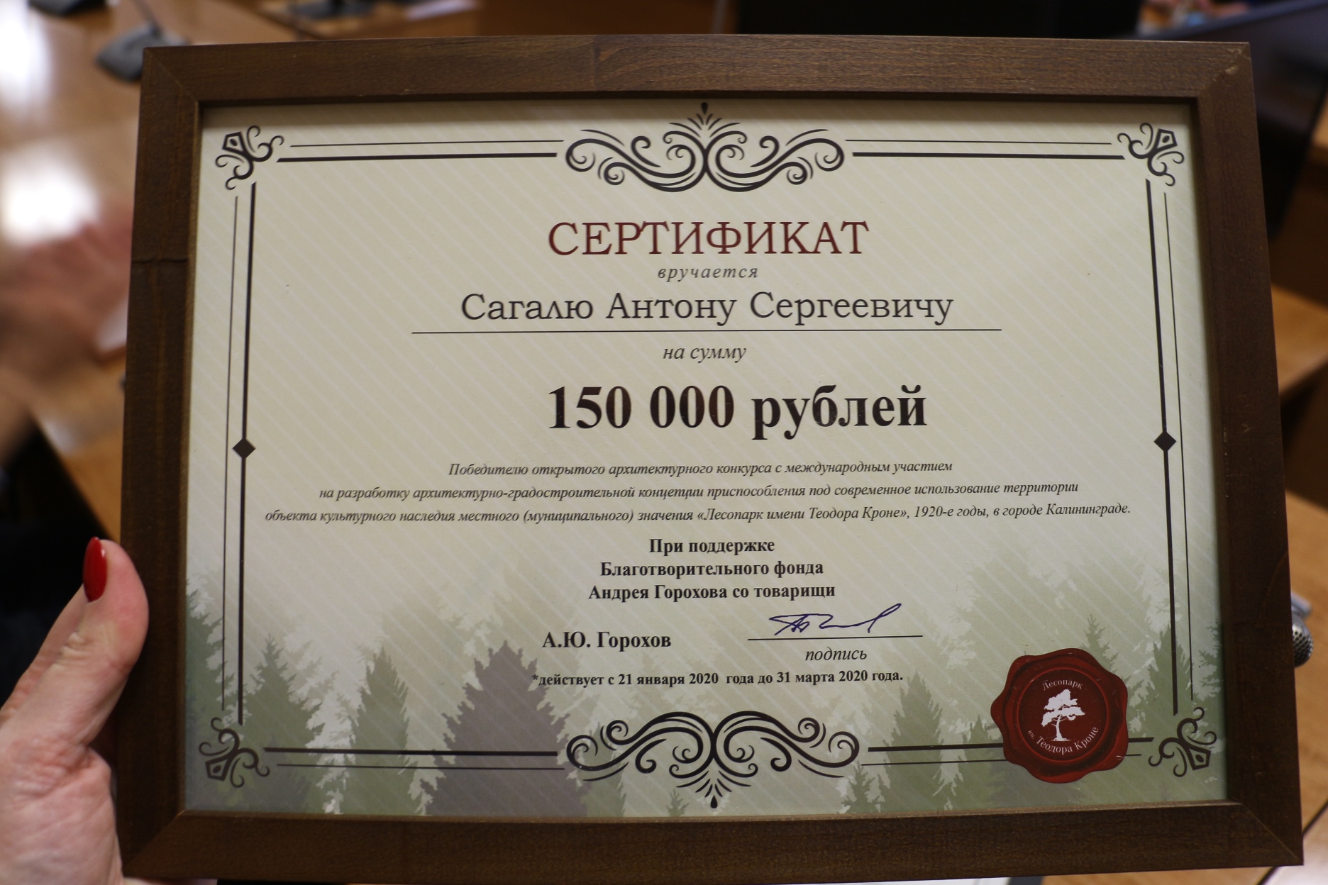 Сегодня эти же лица чествовали конкурсантов, чьи работы членами жюри признаны лучшими. Победило предложение архитектора Антона Сагаля, калининградца, работающего в Милане, который в сотрудничестве с OASI Architects проработал идею отдыха, основанного на созерцании природы и наслаждения покоем. Антону вручен главный приз – сертификат на 150 тысяч рублей и благодарственное письмо от организаторов конкурса. Такие же благодарственные письма Антон увезет членам своей команды, работавшим вместе с ним над проектом, который максимально учел пожелания горожан, участвовавших в подготовке к конкурсу с самого начала.