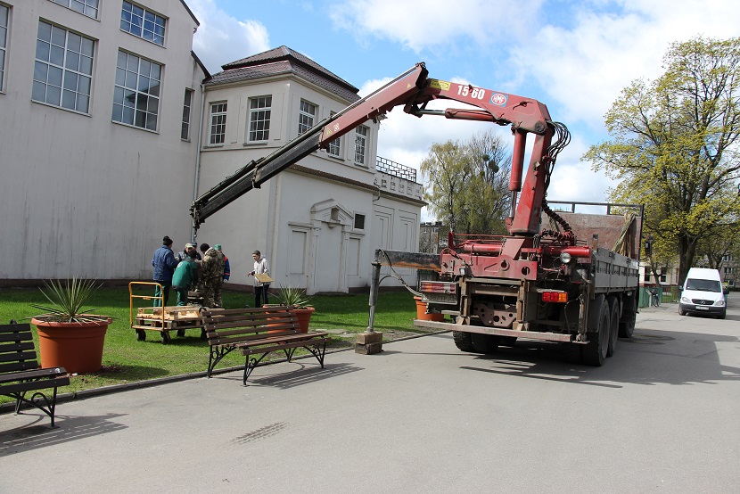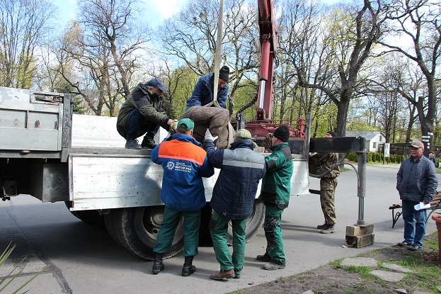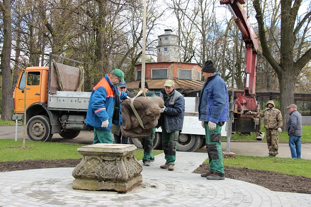 В операции по «переселению» орангутана принимали участие шесть человек и манипулятор. Скульптору весом белее 100 килограмм вместе с постаментом аккуратно погрузили в машину, а затем установили на специально подготовленной площадке напротив фасада Тропического дома.