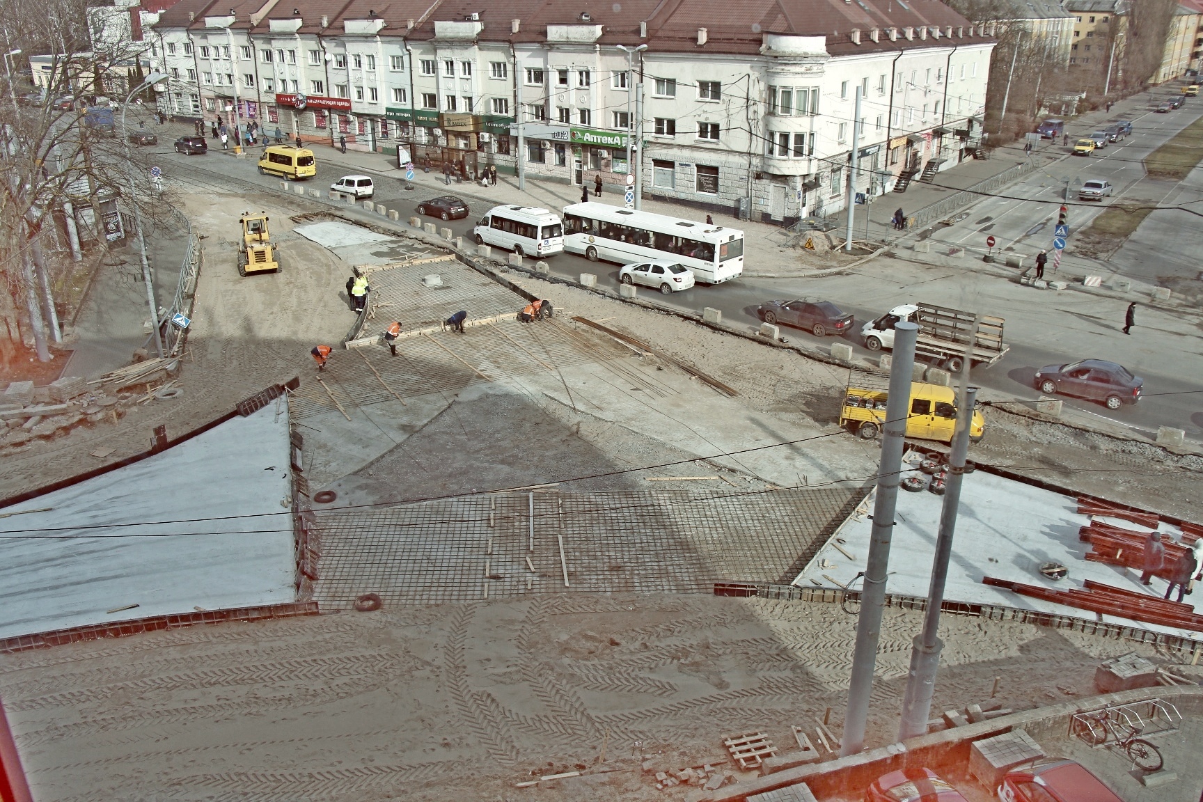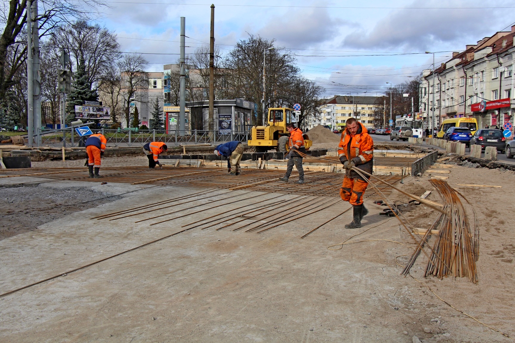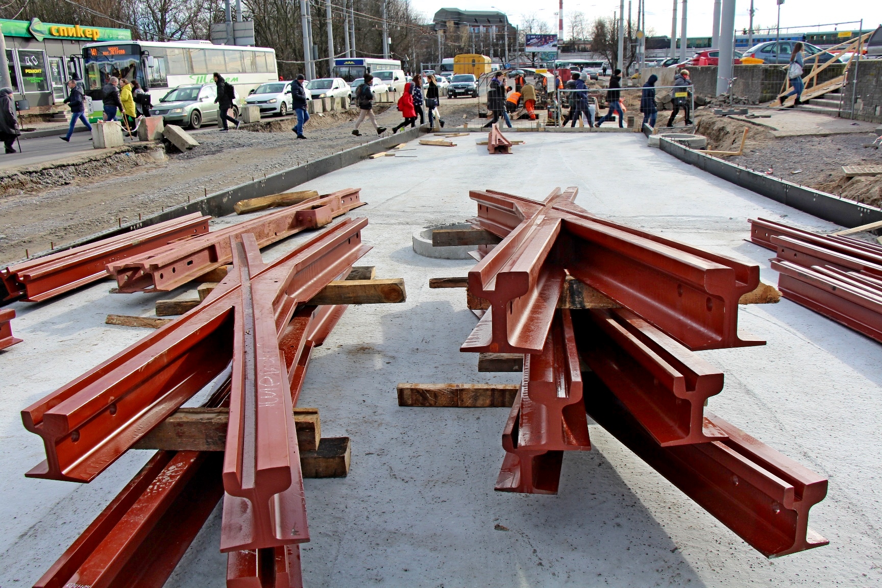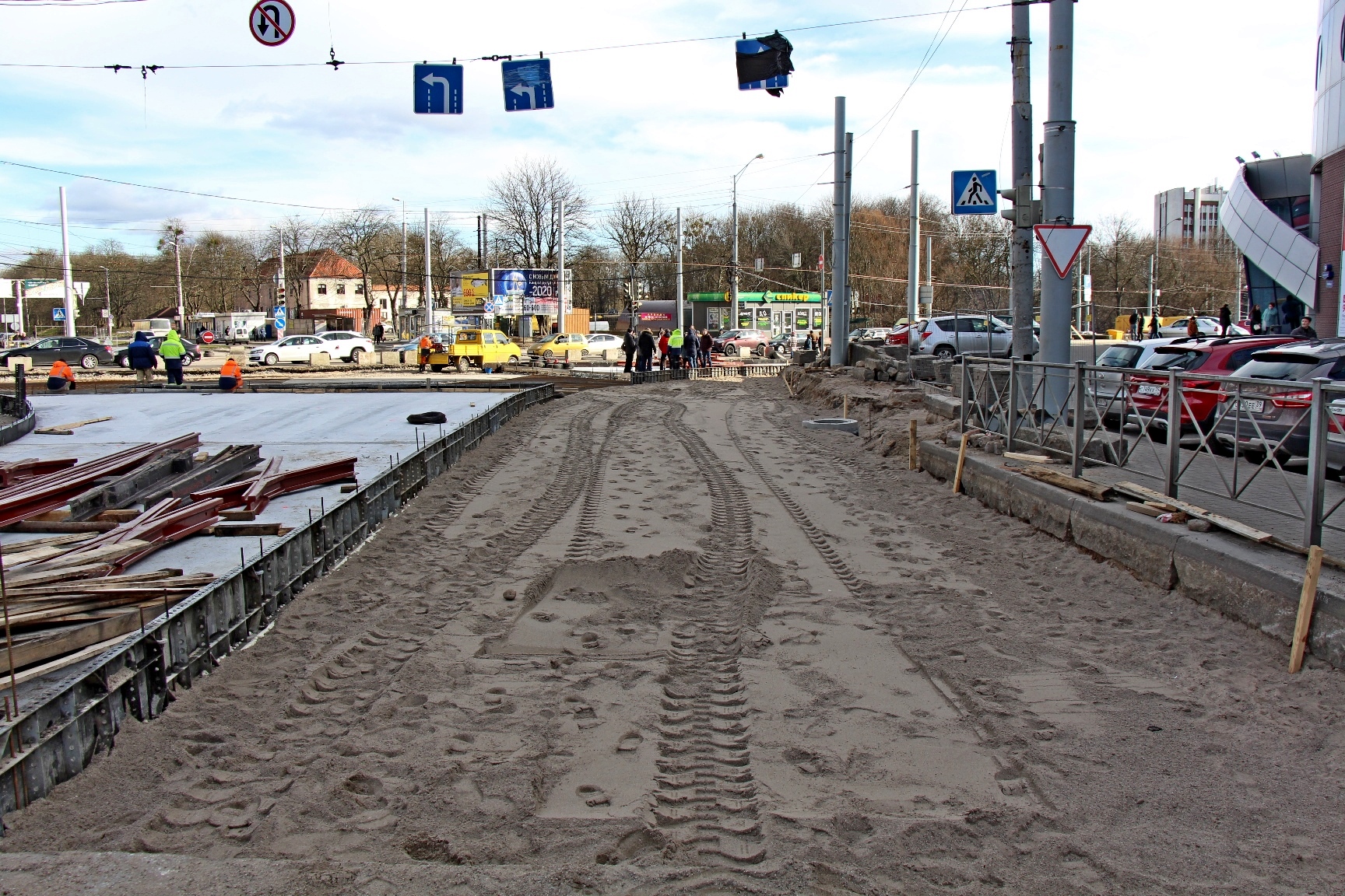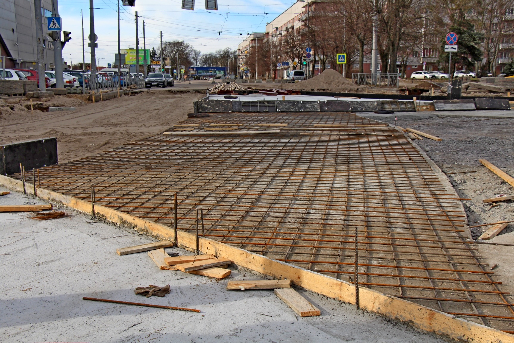 Сейчас перекрёсток «разбит на квадратики» - монтажники «МКУ «Калининград-ГорТранс» на нижнем бетонном основании вяжут арматуру под будущие пути и стрелочные узлы, выставляют опалубку под бетон. На объект завезли новые рельсы и крестовидные стрелочные переводы. На участке со стороны Киевской уже начали выставлять рельсы на порталы.