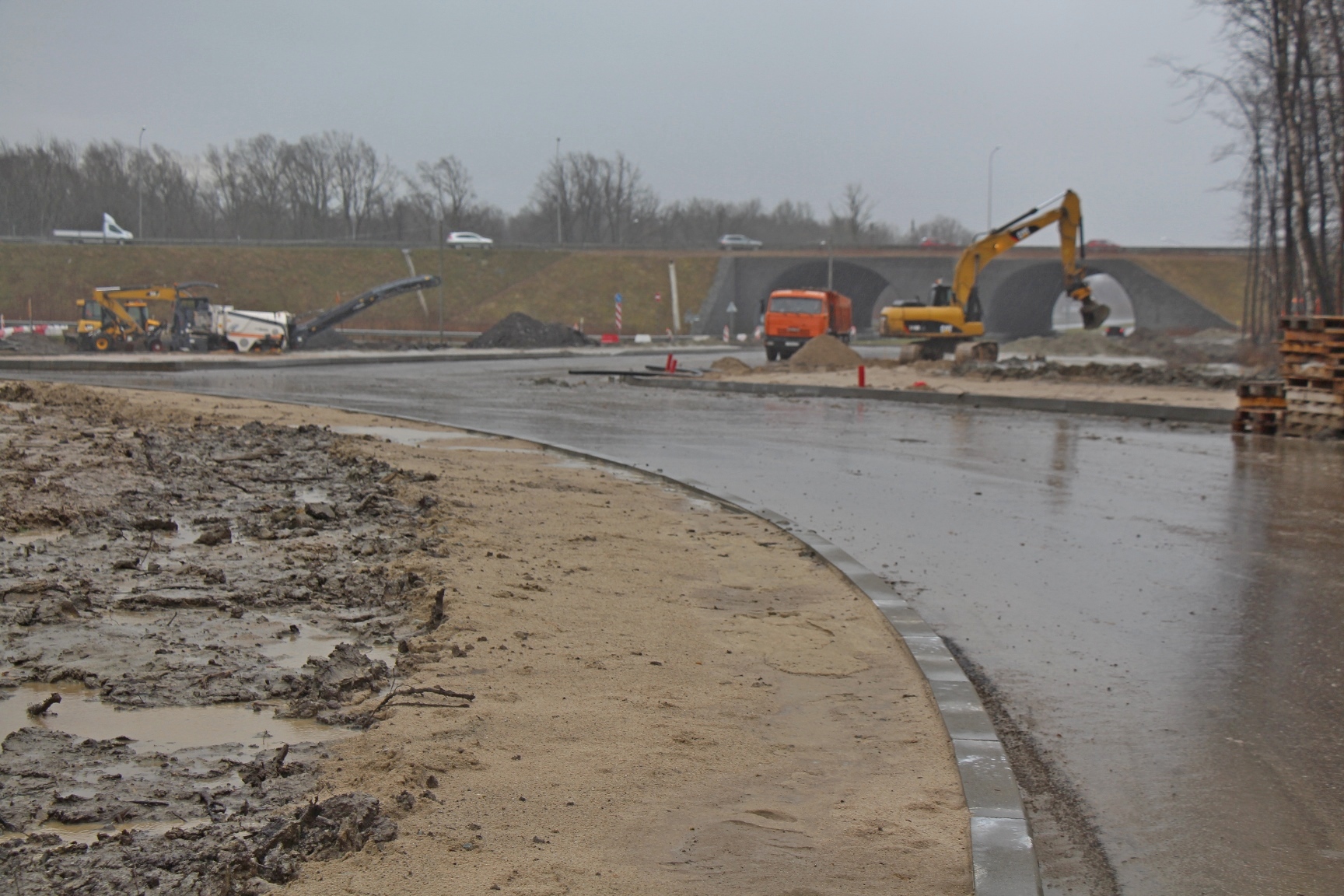 На съездах с Окружной и на разворотном кольце продолжают укрепление откосов, здесь установили бетонные стоки для отвода воды с проезжей части, а также бортовой камень на её границе. Укрепление склонов ведут и на основной дороге по направлению к Чкаловску.